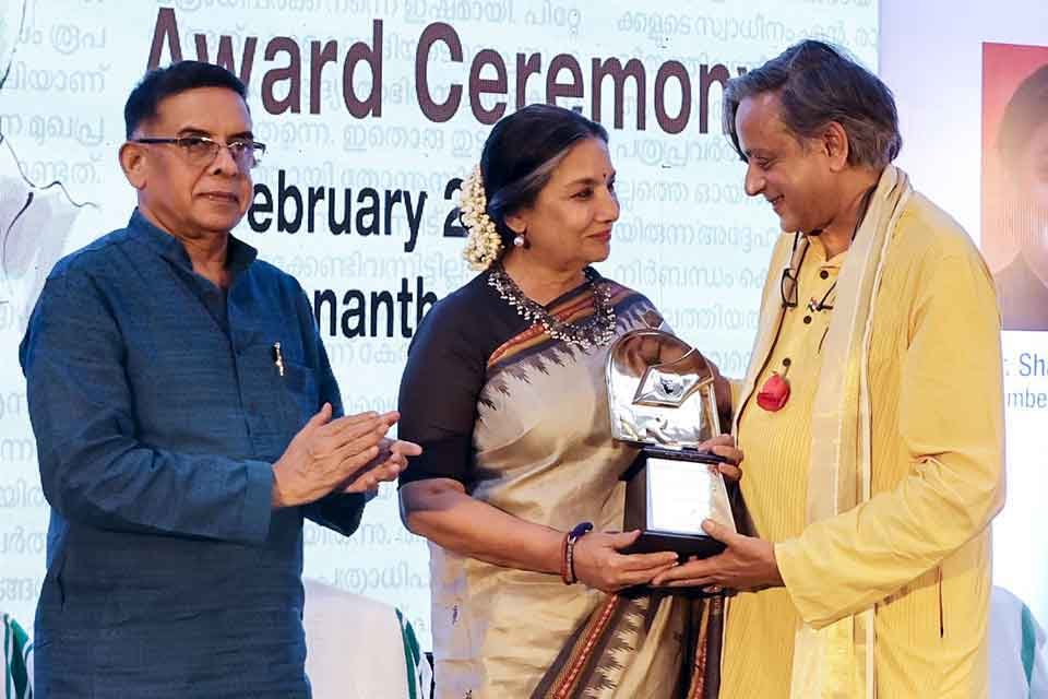 ਕਾਂਗਰਸ ਸੰਸਦ ਮੈਂਬਰ ਸ਼ਸ਼ੀ ਥਰੂਰ ਤਿਰੂਵਨੰਤਪੁਰਮ ਵਿੱਚ ਇੱਕ ਸਮਾਰੋਹ ਦੌਰਾਨ ਅਦਾਕਾਰਾ ਸ਼ਬਾਨਾ ਆਜ਼ਮੀ ਨੂੰ ਐਨ. ਰਾਮਚੰਦਰਨ ਫਾਊਂਡੇਸ਼ਨ ਪੁਰਸਕਾਰ ਪ੍ਰਦਾਨ ਕਰਦੇ ਹੋਏ।