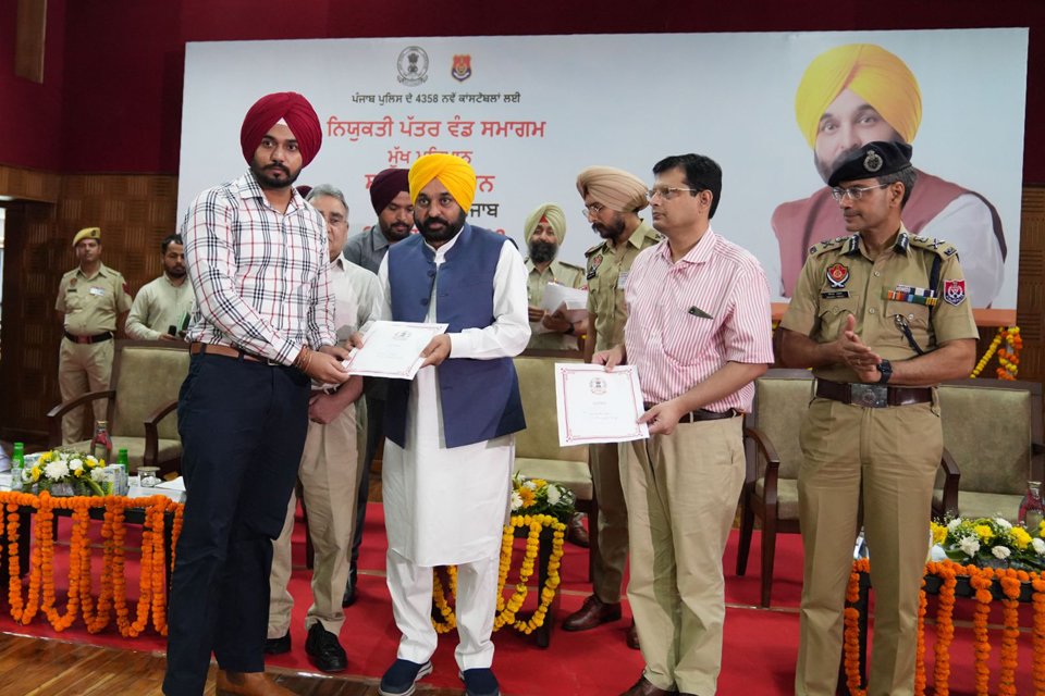 ਇੱਥੇ ਪੰਜਾਬ ਪੁਲਿਸ ਵਿੱਚ ਨਵ-ਨਿਯੁਕਤ 4358 ਸਿਪਾਹੀਆਂ ਨੂੰ ਨਿਯੁਕਤੀ ਪੱਤਰ ਵੰਡਣ ਮੌਕੇ ਇਕੱਠ ਨੂੰ ਸੰਬੋਧਨ ਕਰਦਿਆਂ ਮੁੱਖ ਮੰਤਰੀ ਨੇ ਕਿਹਾ ਕਿ ਸੂਬਾ ਸਰਕਾਰ ਨੇ ਸਾਰੀ ਭਰਤੀ ਪ੍ਰਕਿਰਿਆ ਨਿਰਪੱਖ ਤੇ ਪਾਰਦਰਸ਼ੀ ਢੰਗ ਨਾਲ ਨੇਪਰੇ ਚਾੜ੍ਹੀ ਹੈ। ਉਨ੍ਹਾਂ ਜ਼ੋਰ ਦੇ ਕੇ ਆਖਿਆ ਕਿ ਇਸ ਸਾਰੀ ਭਰਤੀ ਮੁਹਿੰਮ ਦੌਰਾਨ ਸਿਰਫ਼ ਮੈਰਿਟ ਹੀ ਇਕੋ-ਇਕ ਮਾਪਦੰਡ ਸੀ। ਭਗਵੰਤ ਮਾਨ ਨੇ ਅੱਗੇ ਕਿਹਾ ਕਿ ਪੁਲਿਸ ਵਿਭਾਗ ਵਿੱਚ ਖ਼ਾਲੀ ਪਈਆਂ 5739 ਹੋਰ ਆਸਾਮੀਆਂ ਉਤੇ ਭਰਤੀ ਜਲਦੀ ਸ਼ੁਰੂ ਕੀਤੀ ਜਾਵੇਗੀ।