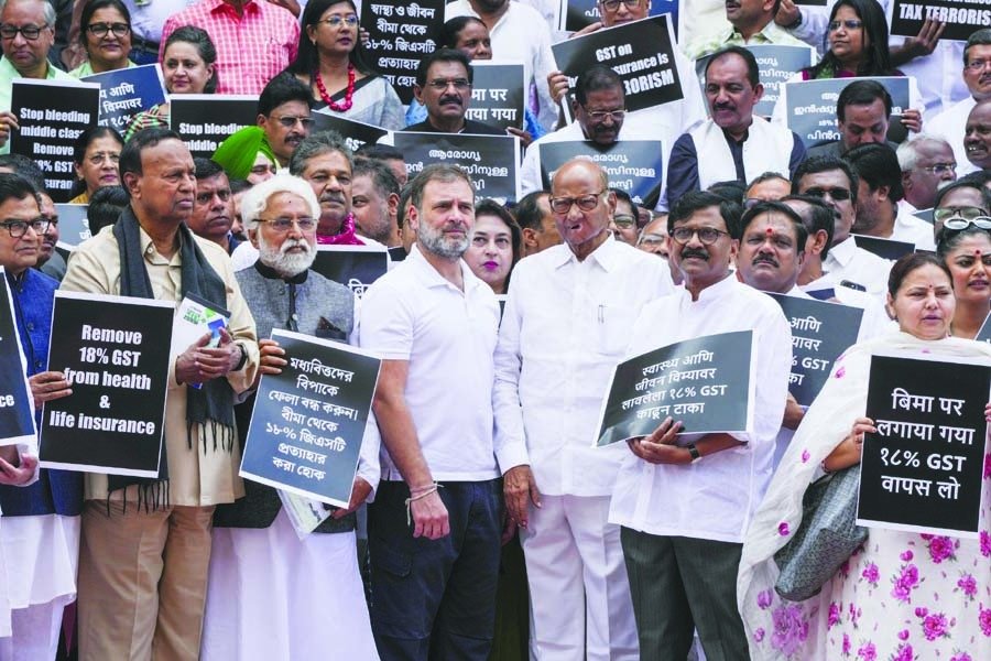 ਕੇ ਵਿਰੋਧ ਪ੍ਰਦਰਸ਼ਨ ਕੀਤਾ, ਜਿਨ੍ਹਾਂ ’ਤੇ ਸਿਹਤ ਬੀਮਾ ਅਤੇ ਜੀਵਨ ਬੀਮਾ ਤੋਂ ਜੀ.ਐਸ.ਟੀ. ਖ਼ਤਮ ਕਰਨ ਦੀ ਮੰਗ ਲਿਖੀ ਹੋਈ ਸੀ। ਉਨ੍ਹਾਂ ਨੇ ਜੀ.ਐਸ.ਟੀ. ਖ਼ਤਮ ਕਰੋ’ ਦੇ ਨਾਅਰੇ ਵੀ ਲਾਏ। ਲੋਕ ਸਭਾ ਵਿਚ ਵਿਰੋਧੀ ਧਿਰ ਦੇ ਨੇਤਾ ਰਾਹੁਲ ਗਾਂਧੀ, ਰਾਸ਼ਟਰਵਾਦੀ ਕਾਂਗਰਸ ਪਾਰਟੀ ਦੇ ਮੁਖੀ ਸ਼ਰਦ ਪਵਾਰ ਅਤੇ ਸਮਾਜਵਾਦੀ ਪਾਰਟੀ, ਤਿ੍ਰਣਮੂਲ ਕਾਂਗਰਸ, ਸ਼ਿਵਸੈਨਾ, ਰਾਸ਼ਟਰਵਾਦੀ ਕਾਂਗਰਸ ਪਾਰਟੀ, ਝਾਰਖੰਡ ਮੁਕਤੀ ਮੋਰਚਾ ਅਤੇ ਕੁਝ ਹੋਰ ਪਾਰਟੀਆਂ ਦੇ ਸੰਸਦ ਮੈਂਬਰ ਵਿਰੋਧ ਪ੍ਰਦਰਸ਼ਨ ’ਚ ਸ਼ਾਮਲ ਹੋਏ। ਕਾਂਗਰਸ ਨੇਤਾ ਪ੍ਰਮੋਦ ਤਿਵਾੜੀ ਨੇ ਕਿਹਾ ਕਿ ਇਹ ਸਰਕਾਰ ਕਫ਼ਨ ਟੈਕਸ ਲਾ ਰਹੀ ਹੈ, ਇਹ ਬਹੁਤ ਵੱਡੀ ਲੁੱਟ ਹੈ। ਇਸ ਖਿਲਾਫ਼ ’ਇੰਡੀਆ’ ਗਠਜੋੜ ਪੁਰਜ਼ੋਰ ਵਿਰੋਧ ਕਰੇਗਾ। ਪਿਛਲੇ ਦਿਨੀਂ ਤਿ੍ਰਣਮੂਲ ਕਾਂਗਰਸ ਦੇ ਸੰਸਦ ਮੈਂਬਰਾਂ ਨੇ ਇਸ ਮੁੱਦੇ ਨੂੰ ਸੰਸਦ ਵਿਚ ਚੁੱਕਿਆ ਸੀ ਅਤੇ ਪਾਰਟੀ ਮੁਖੀ ਅਤੇ ਪੱਛਮੀ ਬੰਗਾਲ ਦੀ ਮੁੱਖ ਮੰਤਰੀ ਮਮਤਾ ਬੈਨਰਜੀ ਨੇ ਇਸ ਮਾਮਲੇ ’ਤੇ ਨਿਰਮਲਾ ਸੀਤਾਰਮਨ ਨੂੰ ਚਿੱਠੀ ਵੀ ਲਿਖੀ ਸੀ। ਕੇਂਦਰੀ ਸੜਕੀ ਆਵਾਜਾਈ ਅਤੇ ਹਾਈਵੇਅ ਮੰਤਰੀ ਨਿਤਿਨ ਗਡਕਰੀ ਨੇ ਵੀ ਵਿੱਤ ਮੰਤਰੀ ਨਿਰਮਲਾ ਸੀਤਾਰਮਨ ਨੂੰ ਜੀਵਨ ਬੀਮਾ ਅਤੇ ਸਿਹਤ ਬੀਮੇ ਦੇ ਪ੍ਰੀਮੀਅਮਾਂ ’ਤੇ 18 ਫ਼ੀਸਦੀ ਜੀ.ਐਸ.ਟੀ. ਹਟਾਉਣ ਦੀ ਬੇਨਤੀ ਕੀਤੀ ਹੈ।