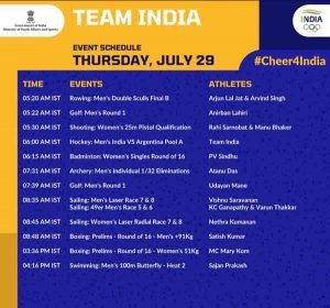 29 ਜੁਲਾਈ ਨੂੰ ਹੋਣ ਵਾਲੇ ਮੁਕਾਬਲਿਆਂ ਵਿੱਚ ਭਾਰਤੀ ਪੁਰਸ਼ ਹਾਕੀ ਟੀਮ ਅਰਜਨਟੀਨਾ ਨਾਲ ਭੀੜੇਗੀ। ਇਸ ਤੋਂ ਇਲਾਵਾ ਪੀ. ਵੀ ਸਿੰਧੂ ਬੈਡਮਿੰਟਨ, ਆਤਨੁ ਦਾਸ ਆਰਚਰੀ, ਅਰਜੁਨ ਲਾਲ ਜਾਟ ਅਤੇ ਅਰਵਿੰਦ ਸਿੰਘ ਡਬਲ ਸੱਕਲ ਰੋਇੰਗ,ਰਾਹੀ ਸਰਨੋਭਟ ਤੇ ਮਨੂ ਭਾਕਰ 25 ਮੀ. ਪਿਸਟਲ ਸ਼ੂਟਿੰਗ, ਉਧਯਾਨ ਮਨੇ ਗੋਲਫ, ਵਿਸ਼ਨੂੰ, ਗਣਪਤੀ ਤੇ ਠੱਕਰ ਸੇਲਿੰਗ, ਸਾਜਨ ਪ੍ਰਕਾਸ਼ ਤੈਰਾਕੀ ਅਤੇ ਮੁੱਕੇਬਾਜ਼ੀ ਵਿੱਚ ਐਮ.ਸੀ ਮੈਰੀ ਕੌਮ ਅਤੇ ਸਤੀਸ਼ ਕੁਮਾਰ ਦਾ ਮੁਕਾਬਲਾ ਦੇਖਣ ਨੂੰ ਮਿਲੇਗਾ।