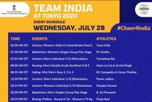 28 ਜੁਲਾਈ ਨੂੰ ਹੋਣ ਵਾਲੇ ਮੁਕਾਬਲਿਆਂ ਵਿੱਚ ਭਾਰਤੀ ਮਹਿਲਾ ਹਾਕੀ ਟੀਮ ਗ੍ਰੇਟ ਬ੍ਰਿਟੇਨ ਨਾਲ ਭੀੜੇਗੀ। ਇਸ ਤੋਂ ਇਲਾਵਾ ਪੀ. ਵੀ ਸਿੰਧੂ ਬੈਡਮਿੰਟਨ, ਤਰੁਨਦੀਪ ਰਾਏ, ਪ੍ਰਵੀਨ ਅਤੇ ਦੀਪਿਕਾ ਕੁਮਾਰੀ ਆਰਚਰੀ, ਅਰਜੁਨ ਲਾਲ ਜਾਟ ਅਤੇ ਅਰਵਿੰਦ ਸਿੰਘ ਰੋਇੰਗ, ਗਣਪਤੀ ਤੇ ਵਰੁਣ ਠੱਕਰ ਸੇਲਿੰਗ ਅਤੇ ਮੁੱਕੇਬਾਜ਼ੀ ਵਿੱਚ ਪੂਜਾ ਰਾਣੀ ਦਾ ਮੁਕਾਬਲਾ ਦੇਖਣ ਨੂੰ ਮਿਲੇਗਾ।