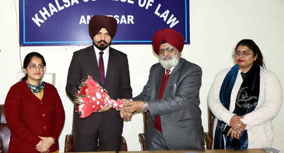 ਖਾਲਸਾ ਕਾਲਜ ਆਫ ਲਾਅ ਵਿਖੇ ਕਰਵਾਏ ਸੈਮੀਨਾਰ ਮੌਕੇ ਕਾਲਜ ਦੇ ਡਾਇਰੈਕਟਰ—ਕਮ—ਪ੍ਰਿੰਸੀਪਲ ਡਾ: ਜਸਪਾਲ ਸਿੰਘ ਫੁੱਲਾਂ ਦਾ ਗੁਲਦਸਤਾ ਸ: ਅਮਰਦੀਪ ਸਿੰਘ ਬੈਂਸ ਨੂੰ ਦੇ ਕੇ ਸਵਾਗਤ ਕਰਦੇ ਹੋਏ। ਨਾਲ ਹੋਰ ਸਟਾਫ।