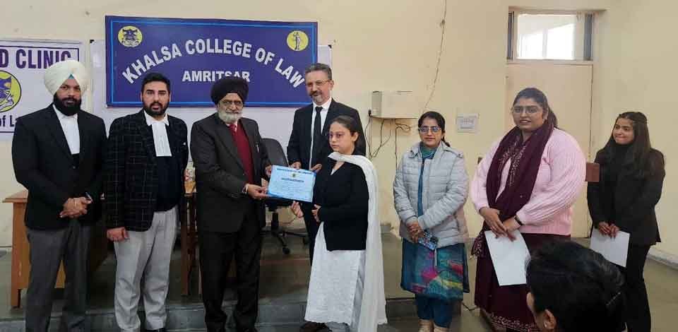ਅੰਮ੍ਰਿਤਸਰ – ਖਾਲਸਾ ਕਾਲਜ ਆਫ਼ ਲਾਅ ਵਿਖੇ ਮੁਫ਼ਤ ਕਾਨੂੰਨੀ ਸਹਾਇਤਾ ਜਾਗਰੂਕਤਾ ਵਿਸ਼ੇ ’ਤੇ ਇਕ ਰੋਜ਼ਾ ਸੈਮੀਨਾਰ ਕਰਵਾਇਆ ਗਿਆ। ਕਾਲਜ ਦੇ ਡਾਇਰੈਕਟਰ-ਕਮ-ਪ੍ਰਿੰਸੀਪਲ ਡਾ. ਜਸਪਾਲ ਸਿੰਘ ਦੇ ਦਿਸ਼ਾ-ਨਿਰਦੇਸ਼ਾਂ ’ਤੇ ਜ਼ਿਲ੍ਹਾ ਕਾਨੂੰਨੀ ਸੇਵਾਵਾਂ ਅਥਾਰਟੀ, ਅੰਮ੍ਰਿਤਸਰ ਦੇ ਸਹਿਯੋਗ ਨਾਲ ਕਰਵਾਏ ਉਕਤ ਸੈਮੀਨਾਰ ਮੌਕੇ ਅਥਾਰਟੀ ਦੇ ਮੈਂਬਰ ਐਡਵੋਕੇਟ ਹਰਪ੍ਰੀਤ ਸਿੰਘ ਜੋਸਨ, ਐਡਵੋਕੇਟ ਸੰਦੀਪ ਸਿੰਘ ਰੰਧਾਵਾ ਅਤੇ ਐਡਵੋਕੇਟ ਅਭਿਜੀਤ ਸਿੰਘ ਸੰਧੂ ਸੈਮੀਨਾਰ ਦੇ ਮਹਿਮਾਨ ਬੁਲਾਰੇ ਵਜੋਂ ਸ਼ਿਰਕਤ ਕੀਤੀ।