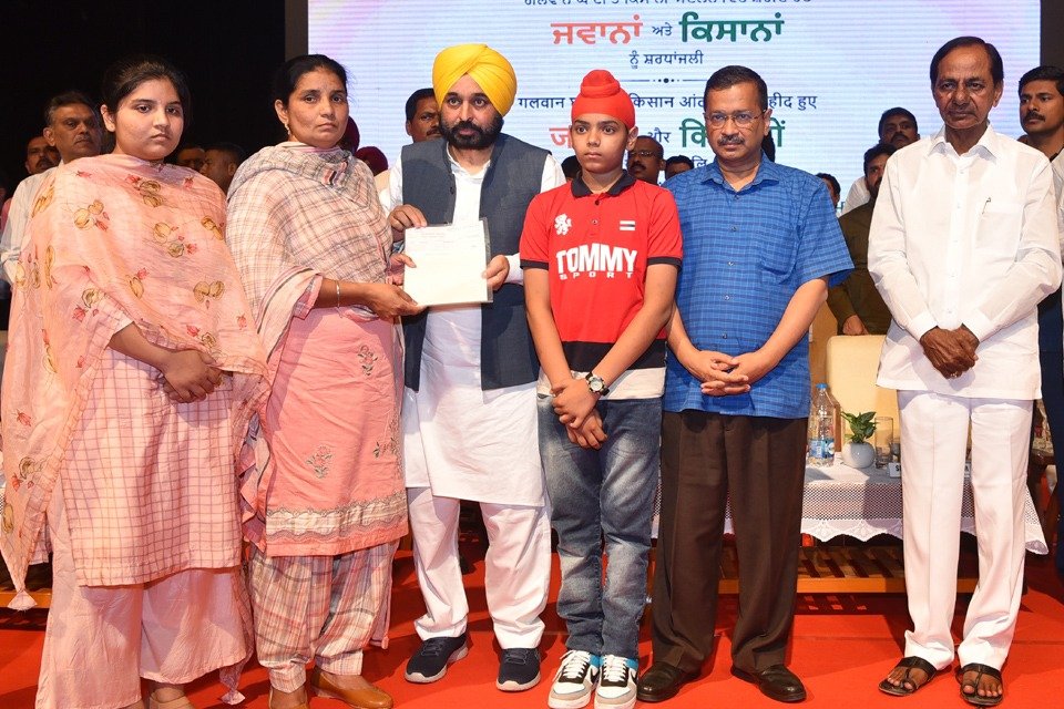 ਚੰਡੀਗੜ – ਕਿਸਾਨ ਅੰਦੋਲਨ ’ਚ ਜਾਨ ਗਵਾਉਣ ਵਾਲੇ ਕਿਸਾਨਾਂ ਦੇ ਪਰਿਵਾਰਾਂ ਨੂੰ ਆਰਥਿਕ ਮਦਦ ਵਜੋਂ ਅੱਜ ਮੁੱਖ ਮੰਤਰੀ ਭਗਵੰਤ ਮਾਨ ਨੇ 3-3 ਲੱਖ ਰੁਪਏ ਦੀ ਆਰਥਿਕ ਮਦਦ ਦਿੱਤੀ। ਇਸ ਦੇ ਨਾਲ ਹੀ ਗਲਵਾਨ ਘਾਟੀ ’ਚ ਸ਼ਹੀਦ ਫੌਜੀ ਜਵਾਨਾਂ ਨੂੰ 10-10 ਲੱਖ ਰੁਪਏ ਦਾ ਮੁਆਵਜ਼ਾ ਦਿੱਤਾ ਗਿਆ। ਮੁੱਖ ਮੰਤਰੀ ਭਗਵੰਤ ਮਾਨ ਤੋਂ ਇਲਾਵਾ ਦਿੱਲੀ ਦੇ ਮੁੱਖ ਮੰਤਰੀ ਅਰਵਿੰਦ ਕੇਜਰੀਵਾਲ, ਤੇਲੰਗਾਨਾ ਦੇ ਮੁੱਖ ਮੰਤਰੀ ਕੇ. ਚੰਦਰਸ਼ੇਖਰ ਰਾਓ ਅਤੇ ਕਿਸਾਨ ਲੀਡਰ ਰਾਕੇਸ਼ ਟਿਕੈਤ ਹਾਜ਼ਰ ਸੀ। ਮਿਉਂਸੀਪਲ ਭਵਨ, ਸੈਕਟਰ 35 ਚੰਡੀਗੜ੍ਹ ਵਿੱਚ ਇਹ ਖਾਸ ਪ੍ਰੋਗਰਾਮ ਰੱਖਿਆ ਗਿਆ ਸੀ। ਇਸ ਦੌਰਾਨ 712 ਕਿਸਾਨਾਂ ਨੂੰ ਚੈੱਕ ਵੰਡੇ ਗਏ।