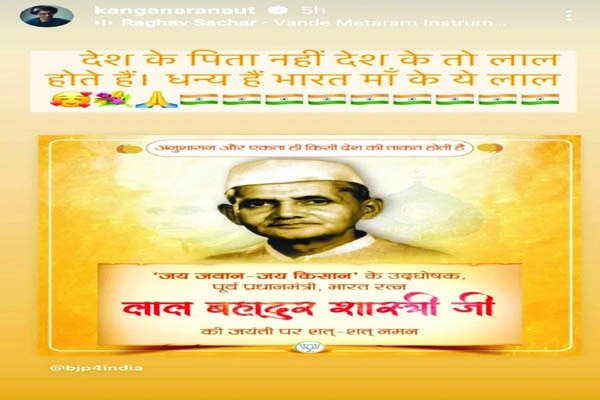 ਕੰਗਨਾ ਨੇ ਆਪਣੀ ਪੋਸਟ ਵਿਚ ਲਿਖਿਆ ਹੈ, ‘‘ਦੇਸ਼ ਦੇ ਪਿਤਾ ਨਹੀਂ, ਦੇਸ਼ ਦੇ ਤਾਂ ਲਾਲ (ਪੁੱਤ) ਹੁੰਦੇ ਹਨ। ਧੰਨ ਹਨ, ਭਾਰਤ ਮਾਂ ਦੇ ਇਹ ਲਾਲ।’’ ਇਸ ਦੇ ਹੇਠਾਂ ਸ਼ਾਸਤਰੀ ਜੀ ਦੀ ਤਸਵੀਰ ਲਾ ਕੇ ਉਨ੍ਹਾਂ ਨੂੰ ਸ਼ਰਧਾਂਜਲੀ ਦਿੱਤੀ ਗਈ ਹੈ। ਉਨ੍ਹਾਂ ਦੀ ਇਸ ਟਿੱਪਣੀ ਨੂੰ ਸ਼ਾਸਤਰੀ ਜੀ ਨੂੰ ਸ਼ਰਧਾਂਜਲੀ ਦੇਣ ਦੇ ਨਾਲ ਹੀ ਮਹਾਤਮਾ ਗਾਂਧੀ ਨੂੰ ‘ਰਾਸ਼ਟਰ ਪਿਤਾ’ ਵਜੋਂ ਸਿਤਕਾਰੇ ਜਾਣ ਉਤੇ ਸਵਾਲ ਖੜ੍ਹੇ ਕਰਨ ਵਜੋਂ ਦੇਖਿਆ ਜਾ ਰਿਹਾ ਹੈ। ਇਸ ਕਾਰਨ ਇਹ ਪੋਸਟ ਚਰਚਾ ਵਿਚ ਆ ਗਈ ਹੈ। ਗ਼ੌਰਤਲਬ ਹੈ ਕਿ ਮਹਾਤਮਾ ਗਾਂਧੀ ਨੂੰ ‘ਰਾਸ਼ਟਰ ਪਿਤਾ’ ਦਾ ਖ਼ਿਤਾਬ ਸਭ ਤੋਂ ਪਹਿਲਾਂ ਸੁਭਾਸ਼ ਚੰਦਰ ਬੋਸ ਨੇ ਦਿੱਤਾ ਸੀ ਅਤੇ ਨੇਤਾ ਜੀ ਬੋਸ ਨੇ ਭਾਰਤ ਦੇ ਆਜ਼ਾਦੀ ਅੰਦੋਲਨ ਵਿਚ ਮਹਾਤਮਾ ਗਾਂਧੀ ਦੇ ਯੋਗਦਾਨ ਨੂੰ ਸਲਾਹਿਆ ਸੀ।