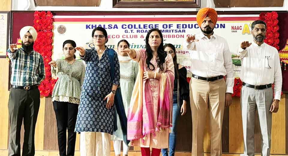ਅੰਮ੍ਰਿਤਸਰ – ਖ਼ਾਲਸਾ ਕਾਲਜ ਆਫ ਐਜੂਕੇਸ਼ਨ ਜੀ. ਟੀ. ਰੋਡ ਵਿਖੇ ਈਕੋ ਕਲੱਬ ਅਤੇ ਰੈਡ ਰਿਬਨ ਕਲੱਬ ਵੱਲੋਂ ਗ੍ਰੀਨ ਦੀਵਾਲੀ ਕਲੀਨ ਦੀਵਾਲੀ ਤਹਿਤ ਪ੍ਰੋਗਰਾਮ ਕਰਵਾਇਆ ਗਿਆ। ਕਾਲਜ ਪ੍ਰਿੰਸੀਪਲ ਡਾ. ਖੁਸ਼ਵਿੰਦਰ ਕੁਮਾਰ ਦੇ ਸਹਿਯੋਗ ਨਾਲ ਕਰਵਾਏ ਗਏ ਇਸ ਪ੍ਰੋਗਰਾਮ ਮੌਕੇ ਡਿਸਟ੍ਰਿਕ ਲੀਗਲ ਸਰਵਿਸਜ ਅਥਾਰਟੀ, ਸੀ. ਜੇ. ਐੱਮ-ਕਮ-ਸਕੈਟਰੀ, ਸ.ਅਮਰਜੀਤ ਸਿੰਘ ਬੈਂਸ ਨੇ ਮੁੱਖ ਮਹਿਮਾਨ ਵਜੋਂ ਸ਼ਿਰਕਤ ਕੀਤੀ।
