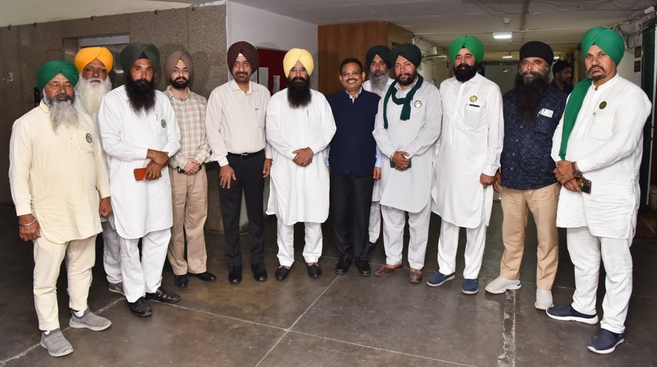 ਖੇਤੀਬਾੜੀ ਮੰਤਰੀ ਅਤੇ ਵਿਸ਼ੇਸ਼ ਮੁੱਖ ਸਕੱਤਰ ਖੇਤੀਬਾੜੀ ਸ੍ਰੀ ਕੇ.ਏ.ਪੀ. ਸਿਨਹਾ ਵੱਲੋਂ ਅੱਜ ਇੱਥੇ ਪੰਜਾਬ ਸਿਵਲ ਸਕੱਤਰੇਤ-1 ਵਿਖੇ ਬੀ.ਕੇ.ਯੂ. (ਦੋਆਬਾ) ਦੇ ਪ੍ਰਧਾਨ ਮਨਜੀਤ ਸਿੰਘ ਰਾਏ ਅਤੇ ਬੀ.ਕੇ.ਯੂ. (ਲੱਖੋਵਾਲ) ਦੇ ਪ੍ਰਧਾਨ ਹਰਿੰਦਰ ਸਿੰਘ ਦੀ ਅਗਵਾਈ ਵਿੱਚ ਆਏ ਗੰਨਾ ਕਾਸ਼ਤਕਾਰਾਂ ਨਾਲ ਮੀਟਿੰਗ ਕੀਤੀ ਗਈ। ਇਸ ਮੀਟਿੰਗ ਵਿੱਚ ਇੰਸਪੈਕਟਰ ਜਨਰਲ ਆਫ਼ ਪੁਲਿਸ (ਆਈ.ਜੀ.) ਇੰਟੈਲੀਜੈਂਸ ਜਸਕਰਨ ਸਿੰਘ ਵੀ ਹਾਜ਼ਰ ਸਨ।