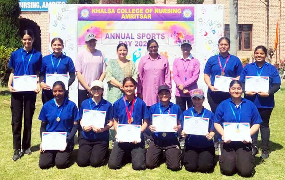 ਅੰਮ੍ਰਿਤਸਰ – ਖਾਲਸਾ ਕਾਲਜ ਆਫ਼ ਨਰਸਿੰਗ ਵਿਖੇ ਸਾਲਾਨਾ ਖੇਡ ਦਿਵਸ-2025 ਪ੍ਰੋਗਰਾਮ ਕਰਵਾਇਆ ਗਿਆ। ਕਾਲਜ ਪ੍ਰਿੰਸੀਪਲ ਡਾ. ਅਮਨਪ੍ਰੀਤ ਕੌਰ ਦੀ ਅਗਵਾਈ ਹੇਠ ਕਰਵਾਏ ਗਏ ਉਕਤ ਪ੍ਰੋਗਰਾਮ ਦੌਰਾਨ ਖ਼ਾਲਸਾ ਯੂਨੀਵਰਸਿਟੀ ਦੇ ਰਜਿਸਟਰਾਰ ਸ੍ਰੀ ਖੁਸ਼ਵਿੰਦਰ ਕੁਮਾਰ ਨੇ ਮੁੱਖ ਮਹਿਮਾਨ ਵਜੋਂ ਸ਼ਿਰਕਤ ਕਰਦਿਆਂ ਵਿਦਿਆਰਥੀਆਂ ਨੂੰ ਆਪਸੀ ਖੇਡ ਭਾਵਨਾ ਅਤੇ ਸਰੀਰਿਕ ਤੰਦਰੁਸਤੀ ਸਬੰਧੀ ਆਪਣੇ ਵਿਚਾਰ ਸਾਂਝੇ ਕੀਤੇ। ਇਸ ਖੇਡ ਮੁਕਾਬਲੇ ਦੀ ਸ਼ੁਰੂਆਤ ਬੈਡਮਿੰਟਨ, ਮਾਰਬਲ ਰੇਸ, ਥ੍ਰੀ ਲੈੱਗ ਰੇਸ, ਚਾਟੀ ਰੇਸ, ਆਕਟੋਪਸ ਰੇਸ, 100 ਮੀਟਰ ਰੇਸ, ਰੀਲੇਅ, ਲੌਂਗ ਜੰਪ, ਸ਼ਾਟ ਪੁਟ, ਜੈਵਲਿਨ ਥ੍ਰੋ ਅਤੇ ਟਗ ਆਫ਼ ਵਾਰ ਸਮੇਤ ਵੱਖ-ਵੱਖ ਟਰੈਕ ਅਤੇ ਫ਼ੀਲਡ ਈਵੈਂਟਸ ਨਾਲ ਹੋਈ।