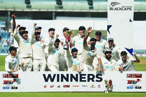 ਮੁੰਬਈ – ਨਿਊਜ਼ੀਲੈਂਡ ਨੇ ਤੀਜੇ ਤੇ ਆਖ਼ਰੀ ਟੈਸਟ ਕ੍ਰਿਕਟ ਮੈਚ ਦੇ ਤੀਜੇ ਦਿਨ ਅੱਜ ਇੱਥੇ 25 ਦੌੜਾਂ ਨਾਲ ਜਿੱਤ ਦਰਜ ਕਰ ਕੇ ਤਿੰਨ ਮੈਚਾਂ ਦੀ ਲੜੀ 3-0 ਨਾਲ ਜਿੱਤ ਕੇ ਇਤਿਹਾਸ ਸਿਰਜ ਦਿੱਤਾ। ਨਿਊਜ਼ੀਲੈਂਡ ਨੇ ਆਪਣੀ ਦੂਜੀ ਪਾਰੀ ਵਿੱਚ 174 ਦੌੜਾਂ ਬਣਾ ਕੇ ਭਾਰਤ ਦੇ ਸਾਹਮਣੇ 147 ਦੌੜਾਂ ਦਾ ਟੀਚਾ ਰੱਖਿਆ ਪਰ ਕਈ ਸੀਨੀਅਰ ਬੱਲੇਬਾਜ਼ਾਂ ਦੀ ਮੌਜੂਦਗੀ ਵਾਲੀ ਭਾਰਤੀ ਟੀਮ ਲਈ ਇਹ ਪਹਾੜ ਵਰਗਾ ਬਣ ਗਿਆ। ਰਿਸ਼ਭ ਪੰਤ ਦੀ 64 ਦੌੜਾਂ ਦੀ ਪਾਰੀ ਦੇ ਬਾਵਜੂਦ ਭਾਰਤੀ ਟੀਮ 29.1 ਓਵਰਾਂ ਵਿੱਚ 121 ਦੌੜਾਂ ’ਤੇ ਆਊਟ ਹੋ ਗਈ। ਇਹ ਪਹਿਲੀ ਵਾਰ ਹੈ ਜਦੋਂ ਭਾਰਤੀ ਟੀਮ ਆਪਣੀ ਧਰਤੀ ’ਤੇ ਤਿੰਨ ਮੈਚਾਂ ਦੀ ਲੜੀ 3-0 ਨਾਲ ਹਾਰੀ ਹੈ।