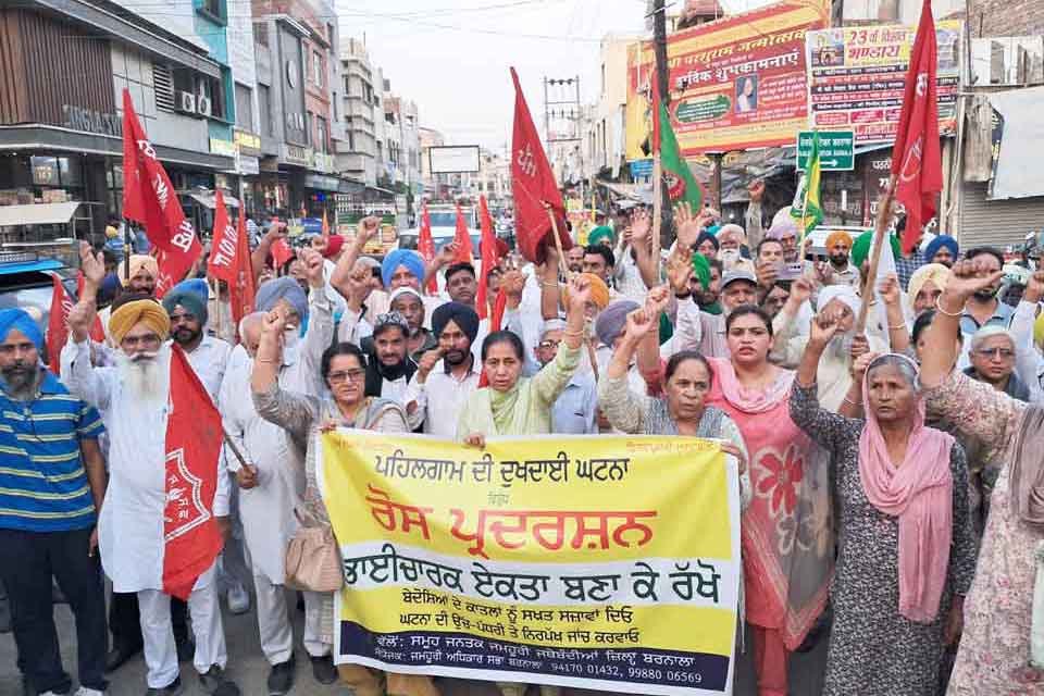 ਬਰਨਾਲਾ – ਜਮਹੂਰੀ ਅਧਿਕਾਰ ਸਭਾ ਬਰਨਾਲਾ ਦੇ ਸੱਦੇ ’ਤੇ ਬਰਨਾਲਾ ਜਿਲ੍ਹੇ ਦੀਆਂ ਸਮੂਹ ਜਨਤਕ ਜਮਹੂਰੀ ਜਥੇਬੰਦੀਆਂ ਨੇ ਸਿਵਲ ਹਸਪਤਾਲ ਬਰਨਾਲਾ ਦੇ ਪਾਰਕ ਨੇੜੇ ਇਕ ਭਰਵੀਂ ਰੈਲੀ ਕਰਕੇ ਪਹਿਲਗਾਮ ਦੀ ਘਟਨਾ ਦੀ ਸਖਤ ਸ਼ਬਦਾਂ ਵਿਚ ਨਿਖੇਧੀ ਕੀਤੀ ਅਤੇ ਉਪਰੰਤ ਸ਼ਹਿਰ ਵਿਚ ਰੋਸ ਮਾਰਚ ਕਰਕੇ, ਮੌਜੂਦਾ ਉਤੇਜ਼ਨਾ ਭਰੇ ਮਾਹੌਲ ਵਿਚ ਭਾਈਚਾਰਕ ਏਕਤਾ ਬਣਾਈ ਰੱਖਣ ਦੀ ਜ਼ਰੂਰਤ ’ਤੇ ਜ਼ੋਰ ਦਿਤਾ। ਸਭਾ ਦੀ ਬਰਨਾਲਾ ਇਕਾਈ ਦੇ ਪ੍ਰਧਾਨ ਸੋਹਣ ਸਿੰਘ ਮਾਝੀ ਕੇ ਕਿਹਾ ਕਿ ਇਹ ਮੰਦਭਾਗੀ ਘਟਨਾ ਲੋਕ-ਦੋਖੀ ਤਾਕਤਾਂ ਦੀ ਸਾਜ਼ਿਸ਼ ਹੈ ਜਿਹੜੀਆਂ ਲੋਕਾਂ ਵਿਚ ਫਿਰਕੂ ਵੰਡੀਆਂ ਪਾਉਣੀਆਂ ਚਾਹੁੰਦੀਆਂ ਹਨ।