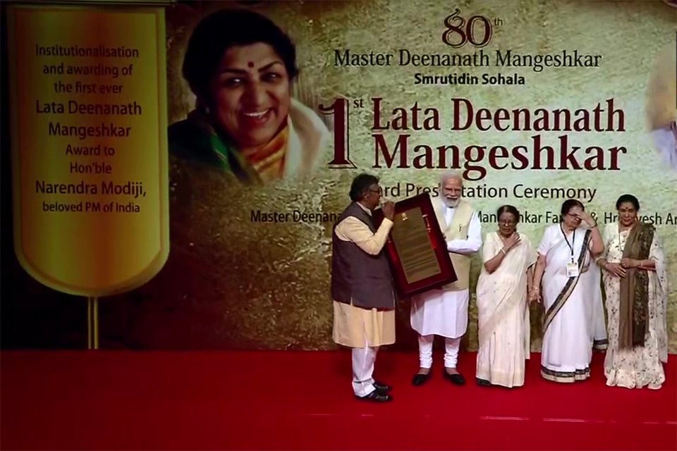 ਮੁੰਬਈ – ਪ੍ਰਧਾਨ ਮੰਤਰੀ ਨਰਿੰਦਰ ਮੋਦੀ ਨੂੰ ਐਤਵਾਰ ਨੂੰ ਮੁੰਬਈ ‘ਚ ਪਹਿਲਾ ਲਤਾ ਦੀਨਾਨਾਥ ਮੰਗੇਸ਼ਕਰ ਪੁਰਸਕਾਰ ਮਿਲਿਆ। ਇਹ ਪੁਰਸਕਾਰ ਪ੍ਰਸਿੱਧ ਗਾਇਕ ਦੀ ਯਾਦ ਅਤੇ ਸਨਮਾਨ ਵਿੱਚ ਸਥਾਪਿਤ ਕੀਤਾ ਗਿਆ ਹੈ, ਜਿਸਦਾ ਇਸ ਸਾਲ ਦੇ ਸ਼ੁਰੂ ਵਿੱਚ ਮੁੰਬਈ ਵਿੱਚ 92 ਸਾਲ ਦੀ ਉਮਰ ਵਿੱਚ ਦਿਹਾਂਤ ਹੋ ਗਿਆ ਸੀ। ਪ੍ਰਧਾਨ ਮੰਤਰੀ ਮੋਦੀ ਨੇ ਊਸ਼ਾ ਮੰਗੇਸ਼ਕਰ, ਆਸ਼ਾ ਭੌਂਸਲੇ, ਮਹਾਰਾਸ਼ਟਰ ਦੇ ਰਾਜਪਾਲ ਭਗਤ ਸਿੰਘ ਕੋਸ਼ਿਆਰੀ, ਮਹਾਰਾਸ਼ਟਰ ਵਿੱਚ ਵਿਰੋਧੀ ਧਿਰ ਦੇ ਨੇਤਾ ਦੇਵੇਂਦਰ ਫੜਨਵੀਸ ਸਮੇਤ ਹੋਰਨਾਂ ਦੀ ਮੌਜੂਦਗੀ ਵਿੱਚ ਪੁਰਸਕਾਰ ਪ੍ਰਾਪਤ ਕੀਤਾ।