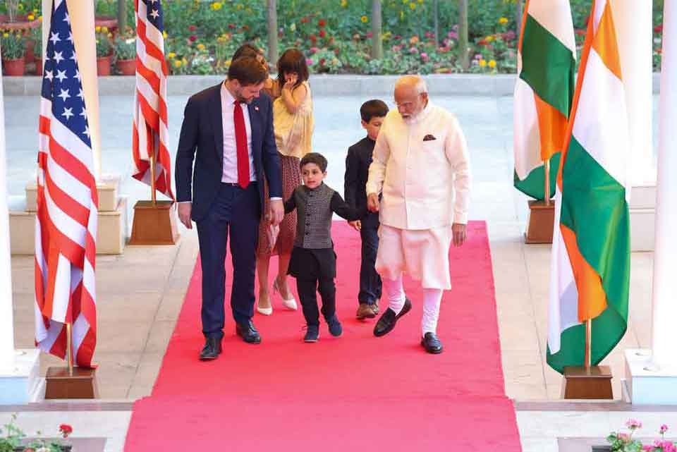 ਚਾਰ ਦਿਨਾਂ ਭਾਰਤ ਯਾਤਰਾ ’ਤੇ ਪਰਵਾਰ ਸਮੇਤ ਦਿੱਲੀ ਪੁੱਜੇ ਅਮਰੀਕੀ ਉਪ-ਰਾਸ਼ਟਰਪਤੀ ਸੋਮਵਾਰ, 21 ਅਪ੍ਰੈਲ ਨੂੰ ਸਵੇਰੇ 9.30 ਵਜੇ ਪਾਲਮ ਏਅਰਬੇਸ ਪਹੁੰਚੇ ਜਿਥੇ ਉਨ੍ਹਾਂ ਦਾ ਸਵਾਗਤ ਕੇਂਦਰੀ ਸਰਕਾਰ ਦੇ ਸੀਨੀਅਰ ਮੰਤਰੀ ਅਸ਼ਵਨੀ ਵੈਸ਼ਨਵ ਨੇ ਕੀਤਾ। ਅਮਰੀਕੀ ਉਪ-ਰਾਸ਼ਟਰਪਤੀ ਦੇ ਦੋਹਾਂ ਮੁੰਡਿਆਂ ਨੇ ਕੁੜਤਾ-ਪਜਾਮਾ ਅਤੇ ਕੁੜੀ ਮੀਰਾਬੇਲ ਨੇ ਹਰੇ ਰੰਗ ਦਾ ਅਨਾਰਕਲੀ ਸੂਟ ਅਤੇ ਜੈਕੇਟ ਪਹਿਨੀ ਹੋਈ ਸੀ। ਅਮਰੀਕੀ ਉਪ-ਰਾਸ਼ਟਰਪਤੀ ਨੂੰ ਏਅਰਬੇਸ ’ਤੇ ਰਸਮੀ ‘ਗਾਰਡ ਆਫ ਆਨਰ’ ਦਿਤਾ ਗਿਆ। ਪ੍ਰਧਾਨ ਮੰਤਰੀ ਮੋਦੀ ਨਾਲ ਮੁਲਾਕਾਤ ਤੋਂ ਇਲਾਵਾ ਵਾਂਸ ਅਤੇ ਉਨ੍ਹਾਂ ਦੇ ਪਰਵਾਰ ਦੀ ਭਾਰਤ ਯਾਤਰਾ ਮੁੱਖ ਤੌਰ ’ਤੇ ਨਿੱਜੀ ਯਾਤਰਾ ਹੈ। ਅਮਰੀਕੀ ਨੇਤਾ ਅਪਣੀ ਦੋ ਦੇਸ਼ਾਂ ਦੀ ਯਾਤਰਾ ਦੇ ਇਟਲੀ ਪੜਾਅ ਦੌਰਾਨ ਈਸਟਰ ਸੰਡੇ ’ਤੇ ਪੋਪ ਫਰਾਂਸਿਸ ਨਾਲ ਨਿੱਜੀ ਮੁਲਾਕਾਤ ਕਰਨ ਤੋਂ ਇਕ ਦਿਨ ਬਾਅਦ ਦਿੱਲੀ ਪਹੁੰਚੇ।