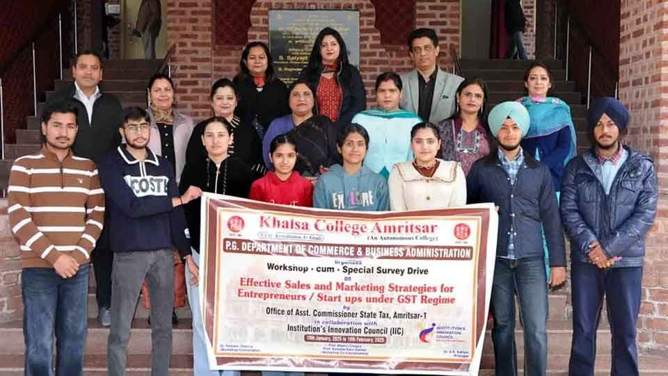 ਅੰਮ੍ਰਿਤਸਰ – ਖਾਲਸਾ ਕਾਲਜ ਦੇ ਕਾਮਰਸ ਐਂਡ ਬਿਜ਼ਨਸ ਐਡਮਿਨਿਸਟ੍ਰੇਸ਼ਨ ਵੱਲੋਂ ਸਹਾਇਕ ਕਮਿਸ਼ਨਰ ਸਟੇਟ ਟੈਕਸ, ਅੰਮ੍ਰਿਤਸਰ-1 ਦੀ ਇੰਸਟੀਚਿਊਟਸ ਇਨੋਵੇਸ਼ਨ ਕੌਂਸਲ (ਆਈ. ਆਈ. ਸੀ.) ਦੇ ਸਹਿਯੋਗ ਨਾਲ ‘ਜੀ. ਐੱਸ. ਟੀ. ਸ਼ਾਸਨ ਅਧੀਨ ਉੱਦਮੀਆਂ, ਸਟਾਰਟ-ਅੱਪਸ ਲਈ ਪ੍ਰਭਾਵਸ਼ਾਲੀ ਵਿਕਰੀ ਅਤੇ ਮਾਰਕੀਟਿੰਗ ਰਣਨੀਤੀਆਂ’ ’ਤੇ ਵਰਕਸ਼ਾਪ-ਕਮ-ਵਿਸ਼ੇਸ਼-ਸਰਵੇਖਣ ਡਰਾਈਵ ਦਾ ਆਯੋਜਨ ਕੀਤਾ। ਵਰਕਸ਼ਾਪ ਦੀ ਯੋਜਨਾਬੰਦੀ ਅਤੇ ਸੰਚਾਲਨ ਕਾਰਜਕਾਰੀ ਪ੍ਰਿੰਸੀਪਲ ਡਾ. ਏ. ਕੇ. ਕਾਹਲੋਂ, ਡਾ. ਗੁਰਸ਼ਰਨ ਕੌਰ, ਡਾ. ਪੂਨਮ ਸ਼ਰਮਾ, ਪ੍ਰੋ. ਮੀਨੂ ਚੋਪੜਾ ਅਤੇ ਪ੍ਰੋ. ਅਨਿੰਦਿਤਾ ਕੌਰ ਕਾਹਲੋਂ ਦੀ ਨਿਗਰਾਨੀ ਹੇਠ ਕੀਤਾ ਗਿਆ ਸੀ।