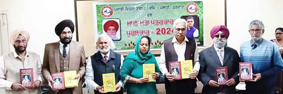 ਫਗਵਾੜਾ – ਪੰਜਾਬੀ ਵਿਰਸਾ ਟਰੱਸਟ (ਰਜਿ:) ਫਗਵਾੜਾ ਵੱਲੋਂ ਪੰਜਾਬ ਚੇਤਨਾ ਮੰਚ ਦੇ ਸਹਿਯੋਗ ਨਾਲ ਫਗਵਾੜਾ ਵਿਖੇ ‘ਮਾਣ ਮੱਤਾ ਪੱਤਰਕਾਰ ਪੁਰਸਕਾਰ-2024‘ ਸਮਾਗਮ ਕਰਵਾਇਆ ਗਿਆ। ਇਸ ਸਮਾਗਮ ਦੀ ਪ੍ਰਧਾਨਗੀ ਡਾ. ਵਰਿਆਮ ਸਿੰਘ ਸੰਧੂ, ਸਤਨਾਮ ਸਿੰਘ ਮਾਣਕ, ਡਾ. ਲਖਵਿੰਦਰ ਸਿੰਘ ਜੌਹਲ, ਡਾ. ਰਣਜੀਤ ਸਿੰਘ ਘੁੰਮਣ, ਦੀਪਕ ਸ਼ਰਮਾ ਚਨਾਰਥਲ, ਪ੍ਰੋ. ਜਸਵੰਤ ਸਿੰਘ ਗੰਡਮ ਅਤੇ ਸਮਾਜ ਸੇਵੀ ਅਵਤਾਰ ਸਿੰਘ ਸਪਰਿੰਗਫੀਲਡ (ਯੂ.ਐਸ.ਏ.) ਨੇ ਕੀਤੀ। ਇਸ ਸਮਾਗਮ ਵਿੱਚ ਪ੍ਰਸਿੱਧ ਅਰਥ-ਸ਼ਾਸਤਰੀ ਅਤੇ ਕਾਲਮਨਵੀਸ ਡਾ. ਰਣਜੀਤ ਸਿੰਘ ਘੁੰਮਣ ਅਤੇ ਪ੍ਰਸਿੱਧ ਫੀਲਡ ਪੱਤਰਕਾਰ ਦੀਪਕ ਸ਼ਰਮਾ ਚਨਾਰਥਲ ਨੂੰ ਮਾਣ ਪੱਤਰ, ਮੰਮੰਟੋ, ਦੁਸ਼ਾਲਾ ਤੇ ਨਕਦ ਰਾਸ਼ੀ ਦਿੱਤੀ ਗਈ। ਇਸ ਮੌਕੇ ਡਾ. ਹਰਪ੍ਰੀਤ ਕੌਰ ਖ਼ਾਲਸਾ ਵੱਲੋਂ ਪੰਜਾਬੀ ਤੇ ਅੰਗਰੇਜ਼ੀ ‘ਚ ਲਿਖੀ ਪੁਸਤਕ “ਤੋਸ਼ਾਖਾਨਾ” ਲੋਕ ਅਰਪਨ ਕੀਤੀ ਗਈ। ਡਾ.ਰਣਜੀਤ ਸਿੰਘ ਘੁੰਮਣ ਅਤੇ ਸਤਨਾਮ ਸਿੰਘ ਮਾਣਕ ਨੇ “ਪੰਜਾਬ ਦੀਆਂ ਚਣੌਤੀਆਂ ਅਤੇ ਸੰਭਾਵਨਾਵਾਂ” ਵਿਸ਼ੇ ‘ਤੇ ਇਸ ਸਮੇਂ ਵਿਚਾਰ ਪੇਸ਼ ਕੀਤੇ।