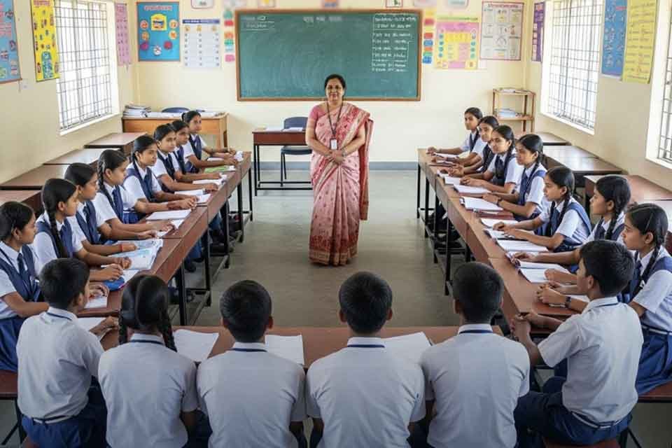 ਕਲਾਸਰੂਮ ਵਿੱਚ ਕਤਾਰਾਂ ਅਤੇ ਕਾਲਮਾਂ ਤੋਂ ਲੈ ਕੇ ਯੂ-ਆਕਾਰ ਵਾਲੀ ਸੀਟਿੰਗ ਤੱਕ ਕੇਰਲ ਦੇ ਰਾਮਾਵਿਲਾਸੋਮ ਵੋਕੇਸ਼ਨਲ ਹਾਇਰ ਸੈਕੰਡਰੀ ਸਕੂਲ ਵਿੱਚ ਮੇਜ਼ ਕਲਾਸਰੂਮ ਦੀਆਂ ਚਾਰ ਦੀਵਾਰਾਂ ਦੇ ਨਾਲ ਯੂ ਜਾਂ ਵੀ-ਆਕਾਰ ਵਿੱਚ ਰੱਖੇ ਗਏ ਸਨ, ਹਰ ਸੀਟ ਨੂੰ “ਮੂਹਰਲੀ ਕਤਾਰ” ਵਿੱਚ ਬਦਲ ਦਿੰਦੇ ਸਨ।