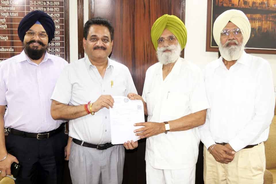 ਖ਼ਾਲਸਾ ਯੂਨੀਵਰਸਿਟੀ ਨੂੰ ਪੀ. ਸੀ. ਆਈ. ਮਿਲੀ ਪ੍ਰਵਾਨਗੀ ਸਬੰਧੀ ਦਸਤਾਵੇਜ਼ ਵਿਖਾਉਂਦੇ ਹੋਏ ਸ: ਰਜਿੰਦਰ ਮੋਹਨ ਸਿੰਘ ਛੀਨਾ ਨਾਲ ਡਾ. ਆਰ. ਕੇ. ਧਵਨ, ਡਾ. ਮਹਿਲ ਸਿੰਘ ਤੇ ਹੋਰ।
