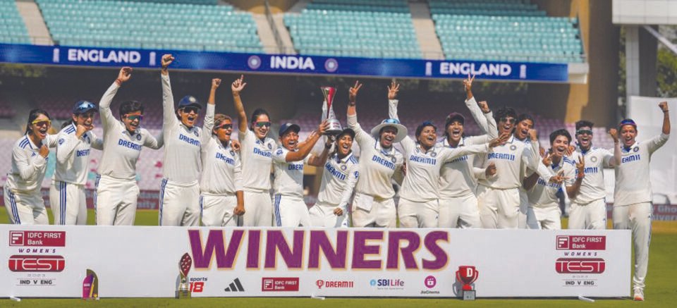 ਨਵੀਂ ਮੁੰਬਈ –  ਮੁੰਬਈ ਦੇ ਡੀਵਾਈ ਪਾਟਿਲ ਸਟੇਡੀਅਮ ਵਿੱਚ ਭਾਰਤੀ ਮਹਿਲਾ ਕ੍ਰਿਕਟ ਟੀਮ ਅਤੇ ਇੰਗਲੈਂਡ ਦੀ ਮਹਿਲਾ ਟੀਮ ਵਿਚਾਲੇ ਇੱਕੋ-ਇੱਕ ਟੈਸਟ ਮੈਚ ਖੇਡਿਆ ਗਿਆ। ਹਰਮਨਪ੍ਰੀਤ ਕੌਰ ਦੀ ਕਪਤਾਨੀ ਹੇਠ ਭਾਰਤ ਨੇ ਇੰਗਲੈਂਡ ਨੂੰ 347 ਦੌੜਾਂ ਦੇ ਵੱਡੇ ਫ਼ਰਕ ਨਾਲ ਹਰਾਇਆ। ਮੇਜ਼ਬਾਨ ਟੀਮ ਨੇ ਇੰਗਲੈਂਡ ਨੂੰ ਜਿੱਤ ਲਈ 479 ਦੌੜਾਂ ਦਾ ਟੀਚਾ ਦਿੱਤਾ ਸੀ। ਜਵਾਬ ‘’ਚ ਇੰਗਲੈਂਡ ਦੇ ਸਾਰੇ ਬੱਲੇਬਾਜ਼ 131 ਦੌੜਾਂ ‘’ਤੇ ਪੈਵੇਲੀਅਨ ਪਰਤ ਗਏ। ਪਹਿਲੀ ਪਾਰੀ ‘’ਚ ਵੀ ਇੰਗਲੈਂਡ ਦੀ ਟੀਮ ਸਿਰਫ਼ 136 ਦੌੜਾਂ ‘ਤੇ ਆਲ ਆਊਟ ਹੋ ਗਈ ਸੀ। ਭਾਰਤੀ ਮਹਿਲਾਵਾਂ ਨੇ ਪਹਿਲੀ ਵਾਰ ਘਰੇਲੂ ਮੈਦਾਨ ‘ਤੇ ਇੰਗਲੈਂਡ ਖ਼ਿਲਾਫ਼ ਟੈਸਟ ਮੈਚ ਜਿੱਤਿਆ ਹੈ।ਇਸ ਮੈਚ ‘’ਚ ਟੀਮ ਇੰਡੀਆ ਦੀ ਹਰਫਨਮੌਲਾ ਦੀਪਤੀ ਸ਼ਰਮਾ ਨੇ ਦੋਵੇਂ ਪਾਰੀਆਂ ‘’ਚ ਸ਼ਾਨਦਾਰ ਪ੍ਰਦਰਸ਼ਨ ਕਰਦੇ ਹੋਏ 87 ਦੌੜਾਂ ਬਣਾਈਆਂ ਅਤੇ 9 ਵਿਕਟਾਂ ਵੀ ਲਈਆਂ। ਇਹ ਮੈਚ ਜੇਤੂ ਪ੍ਰਦਰਸ਼ਨ ਲਈ ਉਸ ਨੂੰ ਪਲੇਅਰ ਆਫ ਦਾ ਮੈਚ ਚੁਣਿਆ ਗਿਆ। ਪਹਿਲੀ ਪਾਰੀ ‘’ਚ ਬੱਲੇਬਾਜ਼ੀ ਕਰਦੇ ਹੋਏ ਦੀਪਤੀ ਸ਼ਰਮਾ ਨੇ 67 ਦੌੜਾਂ ਦੀ ਸ਼ਾਨਦਾਰ ਅਰਧ ਸੈਂਕੜੇ ਵਾਲੀ ਪਾਰੀ ਖੇਡੀ।ਗੇਂਦਬਾਜ਼ੀ ਕਰਦੇ ਹੋਏ ਉਸ ਨੇ 5 ਵਿਕਟਾਂ ਆਪਣੇ ਨਾਂ ਕੀਤੀਆਂ। ਉਹ ਦੂਜੀ ਪਾਰੀ ਵਿੱਚ ਵੀ 4 ਵਿਕਟਾਂ ਲੈਣ ਵਿੱਚ ਕਾਮਯਾਬ ਰਹੀ।ਇੰਗਲੈਂਡ ਦੇ 20 ਬੱਲੇਬਾਜ਼ ਟੀਮ ਇੰਡੀਆ ਵੱਲੋਂ ਪਹਿਲੀ ਪਾਰੀ ਵਿੱਚ ਬਣਾਈਆਂ 428 ਦੌੜਾਂ ਦੇ ਬਰਾਬਰ ਵੀ ਨਹੀਂ ਬਣਾ ਸਕੇ। ਇਸ ਦਾ ਮਤਲਬ ਹੈ ਕਿ ਇੰਗਲੈਂਡ ਦੀਆਂ ਦੋਵੇਂ ਪਾਰੀਆਂ ਦੇ ਸਕੋਰ ਨੂੰ ਜੋੜਨਾ ਵੀ ਭਾਰਤ ਦੀ ਪਹਿਲੀ ਪਾਰੀ ਵਿੱਚ ਬਣਾਈਆਂ ਦੌੜਾਂ ਦੇ ਬਰਾਬਰ ਨਹੀਂ ਸੀ।ਟੀਮ ਇੰਡੀਆ ਲਈ ਇਸ ਮੈਚ ਵਿੱਚ ਚਾਰ ਬੱਲੇਬਾਜ਼ਾਂ ਨੇ ਅਰਧ ਸੈਂਕੜੇ ਲਗਾਏ। ਚਾਰੇ ਅਰਧ ਸੈਂਕੜੇ ਪਹਿਲੀ ਪਾਰੀ ਵਿੱਚ ਲੱਗੇ।