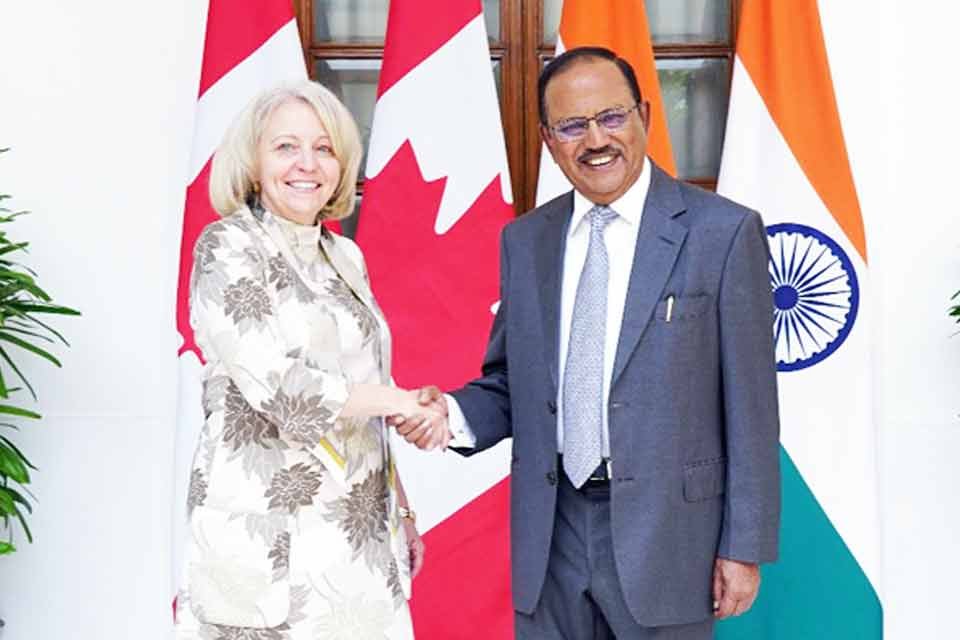 ਭਾਰਤ ਦੇ ਰਾਸ਼ਟਰੀ ਸੁਰੱਖਿਆ ਸਲਾਹਕਾਰ ਅਜੀਤ ਡੋਵਾਲ ਆਪਣੇ ਕੈਨੇਡੀਅਨ ਹਮਰੁਤਬਾ ਨੈਥਲੀ ਜੀ ਡ੍ਰੋਇਨ ਦੇ ਨਾਲ ਉੱਚ-ਪੱਧਰੀ ਗੱਲਬਾਤ ਦੇ ਦੌਰਾਨ।