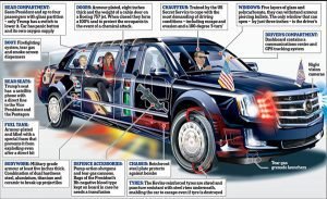 ਵਾਲੀਆਂ ਸਥਿਤੀਆਂ ਦਾ ਮੁਕਾਬਲਾ ਕਰਨ ਦੇ ਸਮਰੱਥ ਹੈ। ਐਮਰਜੈਂਸੀ ‘ਚ ਡਰਾਈਵਰ ਜ਼ਿੰਦਗੀ ਨੂੰ ਸੁਰੱਖਿਅਤ ਢੰਗ ਨਾਲ ਬਚਾ ਸਕਦਾ ਹੈ। ਪਿਛਲੀ ਸੀਟ ‘ਤੇ, ਰਾਸ਼ਟਰਪਤੀ ਨੂੰ ਸੈਟੇਲਾਈਟ ਫੋਨਾਂ ਦੀ ਸਿੱਧੀ ਲਾਈਨ ਉਪ ਰਾਸ਼ਟਰਪਤੀ ਤੇ ਪੈਂਟਾਗੋਨ ਨਾਲ ਜੁੜਦੀ ਹੈ।