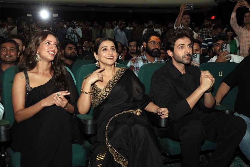 ਬਾਲੀਵੁੱਡ ਅਦਾਕਾਰ ਕਾਰਤਿਕ ਆਰੀਅਨ, ਵਿਦਿਆ ਬਾਲਨ, ਰਾਜਪਾਲ ਯਾਦਵ, ਤ੍ਰਿਪਤੀ ਡਿਮਰੀ ਜੈਪੁਰ ਵਿੱਚ ਆਪਣੀ ਆਉਣ ਵਾਲੀ ਫਿਲਮ ‘ਭੂਲ ਭੁਲਇਆ 3’ ਦੇ ਟ੍ਰੇਲਰ ਲਾਂਚ ਦੌਰਾਨ।
