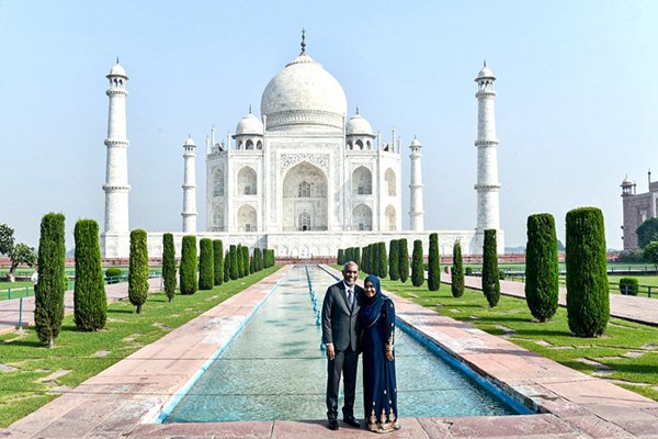 ਆਗਰਾ – ਮਾਲਦੀਵ ਦੇ ਰਾਸ਼ਟਰਪਤੀ ਮੁਹੰਮਦ ਮੁਈਜ਼ੂ ਅਤੇ ਉਨ੍ਹਾਂ ਦੀ ਪਤਨੀ ਸਾਜਿਦਾ ਮੁਹੰਮਦ ਨੇ ਮੰਗਲਵਾਰ ਨੂੰ ਇਤਿਹਾਸਕ ਤਾਜ ਮਹਿਲ ਦਾ ਦੌਰਾ ਕੀਤਾ ਅਤੇ 17ਵੀਂ ਸਦੀ ਦੇ ਆਰਕੀਟੈਕਚਰ ਦੇ ਇਸ ਅਦਭੁਤ ਨਮੂਨੇ ਨੂੰ ਦੇਖ ਕੇ ਮੰਤਰਮੁਗਧ ਹੋ ਗਏ। ਚਾਰ ਦਿਨਾਂ ਦੀ ਦੁਵੱਲੀ ਯਾਤਰਾ ‘ਤੇ ਭਾਰਤ ਆਏ ਮੁਈਜ਼ੂ ਨੇ ਵਿਜ਼ਟਰ ਬੁੱਕ ‘ਚ ਲਿਖਿਆ, ”ਇਸ ਮਕਬਰੇ ਦੀ ਖੂਬਸੂਰਤੀ ਨੂੰ ਬਿਆਨ ਕਰਨਾ ਮੁਸ਼ਕਿਲ ਹੈ। ਮੰਤਰਮੁਗਧ ਕਰ ਦੇਣ ਵਾਲੀ ਇਹ ਵਿਰਾਸਤ ਪਿਆਰ ਅਤੇ ਆਰਕੀਟੈਕਚਰ ਦਾ ਪ੍ਰਮਾਣ ਹੈ।”ਉੱਤਰ ਪ੍ਰਦੇਸ਼ ਦੇ ਮੁੱਖ ਮੰਤਰੀ ਯੋਗੀ ਆਦਿੱਤਿਆਨਾਥ ਦੀ ਤਰਫੋਂ ਰਾਜ ਮੰਤਰੀ ਯੋਗੇਂਦਰ ਉਪਾਧਿਆਏ ਨੇ ਆਗਰਾ ਹਵਾਈ ਅੱਡੇ ‘ਤੇ ਮੁਈਜ਼ੂ ਦਾ ਸਵਾਗਤ ਕੀਤਾ ਅਤੇ ਇਸ ਤੋਂ ਬਾਅਦ ਤਾਜ ਮਹਿਲ ਵਿਚ ਵੀ ਉਨ੍ਹਾਂ ਦਾ ਸ਼ਾਨਦਾਰ ਸਵਾਗਤ ਕੀਤਾ ਗਿਆ। ਉਪਾਧਿਆਏ ਨੇ ਮੁਈਜ਼ੂ ਅਤੇ ਉਨ੍ਹਾਂ ਦੀ ਪਤਨੀ ਨੂੰ ਤਾਜ ਮਹਿਲ ਦੀ ਪ੍ਰਤੀਕ੍ਰਿਤੀ ਭੇਟ ਕੀਤੀ। ਦੋਵਾਂ ਮਹਿਮਾਨਾਂ ਨੇ ਇੱਥੇ ਫੋਟੋਆਂ ਵੀ ਖਿਚਵਾਈਆਂ।ਭਾਰਤੀ ਪੁਰਾਤੱਤਵ ਸਰਵੇਖਣ (ਏ.ਐੱਸ.ਆਈ.) ਦੇ ਇੱਕ ਅਧਿਕਾਰੀ ਨੇ ਕਿਹਾ ਕਿ ਮੁਈਜ਼ੂ ਦੇ ਦੌਰੇ ਦੌਰਾਨ ਤਾਜ ਮਹਿਲ ਸਵੇਰੇ 8 ਵਜੇ ਤੋਂ ਸਵੇਰੇ 10 ਵਜੇ ਤੱਕ ਲੋਕਾਂ ਲਈ ਬੰਦ ਰਿਹਾ। ਮੁਈਜ਼ੂ ਨੇ ‘ਸ਼ਿਲਪਗ੍ਰਾਮ’ ਦਾ ਦੌਰਾ ਵੀ ਕੀਤਾ। ਹਵਾਈ ਅੱਡੇ ਲਈ ਰਵਾਨਾ ਹੋਣ ਤੋਂ ਪਹਿਲਾਂ ਬ੍ਰਜ ਖੇਤਰ ਦੇ ਕਲਾਕਾਰਾਂ ਨੇ ਉਨ੍ਹਾਂ ਦੇ ਸਨਮਾਨ ਵਿੱਚ ਪ੍ਰੋਗਰਾਮ ਪੇਸ਼ ਕੀਤੇ।