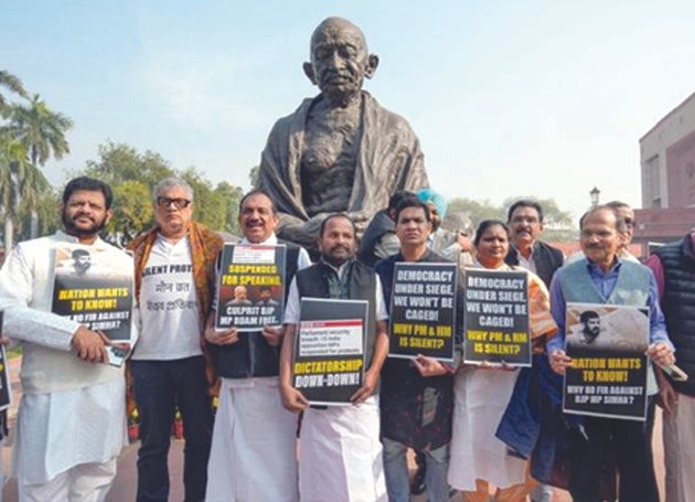 ਮੁਅੱਤਲ ਸੰਸਦ ਮੈਂਬਰਾਂ ਵੱਲੋਂ ਸੰਸਦ ਕੰਪਲੈਕਸ ’ਚ ਹੱਥਾਂ ’ਚ ਤਖ਼ਤੀਆਂ ਫੜ੍ਹ ਕੇ ਪ੍ਰਦਰਸ਼ਨ