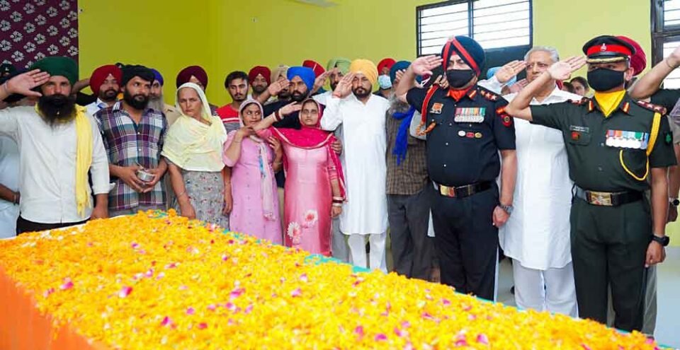 ਨੂਰਪੁਰ ਬੇਦੀ – ਪੰਜਾਬ ਦੇ ਮੁੱਖ ਮੰਤਰੀ ਚਰਨਜੀਤ ਸਿੰਘ ਚੰਨੀ ਨੇ ਸ਼ਹੀਦ ਸਿਪਾਹੀ ਗੱਜਣ ਸਿੰਘ ਨੂੰ ਸ਼ਰਧਾਂਜਲੀ ਭੇਟ ਕੀਤੀ ਜਿਨ੍ਹਾਂ ਦਾ ਸਸਕਾਰ ਰੂਪਨਗਰ ਜ਼ਿਲ੍ਹੇ ਵਿਚ ਉਨ੍ਹਾਂ ਦੇ ਜੱਦੀ ਪਿੰਡ ਪਚਰੰਡਾ ਵਿਖੇ ਪੂਰੇ ਫੌਜੀ ਸਨਮਾਨਾਂ ਨਾਲ ਕੀਤਾ। ਮੁੱਖ ਮੰਤਰੀ ਨੇ ਸ਼ਹੀਦ ਦੀ ਅਰਥੀ ਨੂੰ ਮੋਢਾ ਦਿੱਤਾ ਜਿਨ੍ਹਾਂ ਨਾਲ ਇਸ ਮੌਕੇ ਪੰਜਾਬ ਵਿਧਾਨ ਸਭਾ ਦੇ ਸਪੀਕਰ ਰਾਣਾ ਕੇ.ਪੀ. ਸਿੰਘ ਵੀ ਸ਼ਾਮਲ ਹੋਏ। ਇਸ ਦੌਰਾਨ ਮੁੱਖ ਮੰਤਰੀ ਨੇ ਫੁੱਲ ਮਾਲਾਵਾਂ ਭੇਟ ਕੀਤੀਆਂ, ਸਲਾਮੀ ਦਿੱਤੀ ਅਤੇ ਅਰਦਾਸ ਵਿਚ ਵੀ ਸ਼ਾਮਲ ਹੋਏ। ਉਨ੍ਹਾਂ ਨੇ ਸ਼ਹੀਦ ਦੇ ਪਿਤਾ ਅਤੇ ਭਤੀਜੇ ਨਾਲ ਸੂਰਬੀਰ ਸੈਨਿਕ ਦੀ ਚਿਖਾ ਨੂੰ ਅਗਨੀ ਵੀ ਦਿਖਾਈ। ਸ਼ਹੀਦ ਗੱਜਣ ਸਿੰਘ ਨੇ 11 ਅਕਤੂਬਰ ਨੂੰ ਜੰਮੂ ਕਸ਼ਮੀਰ ਦੇ ਪੁੰਛ ਸੈਕਟਰ ਵਿਚ ਅੱਤਵਾਦੀਆਂ ਨਾਲ ਲੋਹਾ ਲੈਂਦਿਆਂ ਲਾਸਾਨੀ ਕੁਰਬਾਨੀ ਦੇ ਦਿੱਤੀ। ਦੁਖੀ ਪਰਿਵਾਰ ਦੇ ਮੈਂਬਰਾਂ ਨਾਲ ਦਿਲੀ ਹਮਦਰਦੀ ਜ਼ਾਹਰ ਕਰਦੇ ਹੋਏ ਮੁੱਖ ਮੰਤਰੀ ਨੇ ਕਿਹਾ ਕਿ ਸ਼ਹੀਦ ਗੱਜਣ ਸਿੰਘ ਦੀ ਲਾਮਿਸਾਲ ਕੁਰਬਾਨੀ ਬਾਕੀ ਸੈਨਿਕਾਂ ਨੂੰ ਦੇਸ਼ ਦੀ ਏਕਤਾ ਤੇ ਅਖੰਡਤਾ ਦੀ ਰਾਖੀ ਲਈ ਆਪਣੀ ਡਿਊਟੀ ਹੋਰ ਵੀ ਸਮਰਪਿਤ ਭਾਵਨਾ ਅਤੇ ਵਚਨਬੱਧਤਾ ਨਾਲ ਨਿਭਾਉਣ ਲਈ ਸਦਾ ਪ੍ਰੇਰਿਤ ਕਰਦੀ ਰਹੇਗੀ। ਸ਼ਹੀਦ ਗੱਜਣ ਸਿੰਘ ਦੀ ਦੇਹ ਤਿਰੰਗੇ ਚ ਲਪੇਟੀ ਹੋਈ ਸੀ ਅਤੇ ਫੌਜ ਵੱਲੋਂ ਬੜੇ ਹੀ ਅਦਬ ਤੇ ਸਤਿਕਾਰ ਤਰੀਕੇ ਦੇ ਨਾਲ ਬੈਂਡ ਵਾਜੇ ਦੇ ਨਾਲ ਉਸ ਦੀ ਦੇਹ ਨੂੰ ਉਸ ਦੇ ਘਰ ਲਿਆਂਦਾ ਗਿਆ।ਸ਼ਹੀਦ ਦੇ ਪਿਤਾ ਚਰਨ ਸਿੰਘ ਨੇ ਰੌਂਦੇ ਹੋਏ ਕਿਹਾ ਕਿ ਕਿਸਾਨੀ ਝੰਡਾ ਫੜ ਕੇ ਬਰਾਤ ਚੜਿਆ ਸੀ ਗੱਜਣ ਸਿੰਘ ਹੁਣ ਤਿੰਰਗੇ ‘ਚ ਲਿਪਟ ਕੇ ਘਰ ਆਇਆ ਹੈ । ਸ਼ਹੀਦ ਦਾ ਸਸਕਾਰ ਪਿੰਡ ਦੇ ਇੱਕ ਵੱਡੇ ਗਰਾਊਡ ‘ਚ ਕੀਤਾ ਗਿਆ ।