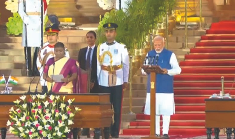 ਨਵੀਂ ਦਿੱਲੀ – ਨਰਿੰਦਰ ਮੋਦੀ ਨੇ ਐਤਵਾਰ ਸ਼ਾਮ ਨੂੰ ਲਗਾਤਾਰ ਤੀਜੀ ਵਾਰ ਪ੍ਰਧਾਨ ਮੰਤਰੀ ਵਜੋਂ ਸਹੁੰ ਚੁੱਕੀ। ਅਜਿਹਾ ਕਰਨ ਵਾਲੇ ਉਹ ਨਹਿਰੂ ਤੋਂ ਬਾਅਦ ਦੂਜੇ ਪ੍ਰਧਾਨ ਮੰਤਰੀ ਬਣ ਗਏ ਹਨ। ਮੋਦੀ ਤੋਂ ਬਾਅਦ ਰਾਜਨਾਥ ਸਿੰਘ, ਅਮਿਤ ਸ਼ਾਹ, ਨਿਤਿਨ ਗਡਕਰੀ, ਜੇਪੀ ਨੱਡਾ ਅਤੇ ਸ਼ਿਵਰਾਜ ਸਿੰਘ ਚੌਹਾਨ ਨੇ ਸਹੁੰ ਚੁੱਕੀ।