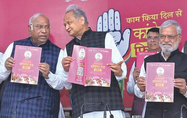 ਪੰਚਾਇਤ ਪੱਧਰ ’ਤੇ ਸਰਕਾਰੀ ਨੌਕਰੀ ਦਾ ਨਵਾਂ ਕਾਰਡ ਬਣਾਇਆ ਜਾਵੇਗਾ। ਰਾਜ ’ਚ ਵਿਧਾਨ ਸਭਾ ਚੋਣਾਂ ਲਈ 25 ਨਵੰਬਰ ਨੂੰ ਵੋਟਿੰਗ ਹੋਵੇਗੀ ਅਤੇ ਵੋਟਾਂ ਦੀ ਗਿਣਤੀ ਤਿੰਨ ਦਸੰਬਰ ਨੂੰ ਹੋਵੇਗੀ। ਕਾਂਗਰਸ ਪ੍ਰਧਾਨ ਮਲਿਕਾਰਜੁਨ ਖੜਗੇ ਨੇ ਮੁੱਖ ਮੰਤਰੀ ਅਸ਼ੋਕ ਗਹਿਲੋਤ ਅਤੇ ਮੈਨੀਫੈਸਟੋ ਕਮੇਟੀ ਦੇ ਪ੍ਰਧਾਨ ਡਾ. ਸੀ.ਪੀ. ਜੋਸ਼ੀ ਨਾਲ ਇੱਥੇ ਕਾਂਗਰਸ ਹੈੱਡ ਕੁਆਰਟਰ ’ਚ ਇਹ ’ਜਨ ਮੈਨੀਫੈਸਟੋ’ ਜਾਰੀ ਕਾਤ। ਇਸ ਮੌਕੇ ਖੜਗੇ ਨੇ ਰਾਜਸਥਾਨ ਨੂੰ ਕਾੰਗਰਸ ਦਾ ਮਜ਼ਬੂਤ ਗੜ੍ਹ ਦੱਸਦੇ ਹੋਏ ਕਿਹਾ,’’ਅਸੀਂ ਉਹੀ ਵਾਅਦੇ ਕਰਦੇ ਹਾਂ, ਜੋ ਪੂਰਾ ਕਰ ਸਕਦੇ ਹਾਂ। 5 ਸਾਲ ’ਚ ਅਸੀਂ ਨੌਜਵਾਨਾਂ ਨੂੰ 10 ਲੱਖ ਨੌਕਰੀਆਂ ਦੇਵਾਂਗੇ। ਉਸ ’ਚੋਂ ਚਾਰ ਲੱਖ ਨੌਕਰੀਆਂ ਸਰਕਾਰੀ ਹੋਣਗੀਆਂ।’’ ਉਨ੍ਹਾਂ ਨੇ ਵਿਸ਼ਵਾਸ ਜਤਾਇਆ ਕਿ ਇਸ ਵਾਰ ਮੁੜ ਰਾਜ ’ਚ ਕਾਂਗਰਸ ਦੀ ਸਰਕਾਰ ਆਏਗੀ। ਮੁੱਖ ਮੰਤਰੀ ਅਸ਼ੋਕ ਗਹਿਲੋਤ ਨੇ ਕਿਹਾ ਕਿ ਰਾਜਸਥਾਨ ਦੀ ਅਰਥਵਿਵਸਥਾ ਇਸ ਸਾਲ ਦੇ ਅੰਤ ਤੱਕ 15 ਲੱਖ ਕਰੋੜ ਰੁਪਏ ਦੀ ਹੋ ਜਾਵੇਗੀ ਅਤੇ 2030 ਤੱਕ ਇਸ ਨੂੰ 30 ਲੱਖ ਕਰੋੜ ਰੁਪਏ ਤੱਕ ਲਿਜਾਉਣ ਦਾ ਟੀਚਾ ਰੱਖਿਆ ਗਿਆ ਹੈ। ਮੈਨੀਫੈਸਟੋ ਕਮੇਟੀ ਦੇ ਪ੍ਰਧਾਨ ਡਾ. ਜੋਸ਼ੀ ਨੇ ਕਿਹਾ,’’ਅਸੀਂ 20230 ਦਾ ਮਿਸ਼ਨ ਲੈ ਕੇ ਚੱਲ ਰਹੇ ਹਾਂ, ਉਸ ਨੂੰ ਹੀ ਮੈਨੀਫੈਸਟੋ ਦਾ ਆਧਾਰ ਬਣਾਇਆ ਗਿਆ ਹੈ। ਇਕ ਨਵਾਂ ਰਾਜਸਥਾਨ ਬਣਾਉਣ ਲਈ 2030 ਦੀ ਕਲਪਣਾ ਲੈ ਕੇ ਅਸੀਂ ਮੈਨੀਫੈਸਟੋ ਪੇਸ਼ ਕਰ ਰਹੇ ਹਾਂ।’’