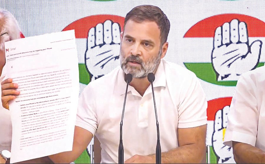 ਕਿ ਤੁਸੀਂ ਸਰਕਾਰ ਦੇ ਨਿਸ਼ਾਨੇ ’ਤੇ ਹੋ। ਸਰਕਾਰ ਸਾਡੀ ਜਾਸੂਸੀ ਕਰ ਰਹੀ ਹੈ। ਸਾਡੇ ਫੋਨ ਟੈਪ ਕੀਤੇ ਜਾ ਰਹੇ ਹਨ ਪਰ ਸਰਕਾਰ ਨੂੰ ਸਮਝਣਾ ਚਾਹੀਦਾ ਹੈ ਕਿ ਇਸ ਨਾਲ ਉਨ੍ਹਾਂ ਨੂੰ ਕੋਈ ਫਰਕ ਨਹੀਂ ਪੈਂਦਾ। ਜਿੰਨੀ ਟੇਪਿੰਗ ਕੀਤੀ ਜਾਵੇ, ਜਿੰਨੀ ਵੀ ਫ਼ੋਨ ਰਿਕਾਰਡਿੰਗ ਕੀਤੀ ਜਾਵੇ, ਇਸ ਨਾਲ ਸਾਨੂੰ ਕੋਈ ਫਰਕ ਨਹੀਂ ਪੈਂਦਾ ਅਤੇ ਅਸੀਂ ਇਸ ਤੋਂ ਪਿੱਛੇ ਹਟਣ ਵਾਲੇ ਨਹੀਂ ਹਾਂ।’’ ਉਨ੍ਹਾਂ ਕਿਹਾ,’’ਕਈ ਵਿਰੋਧੀ ਨੇਤਾ ਆਪਣੇ ਐਪਲ ਫੋਨ ਅਤੇ ਹੋਰ ਡਿਵਾਈਸਾਂ ਦੀ ’ਹੈਕਿੰਗ’ ਦਾ ਦੋਸ਼ ਲਗਾ ਰਹੇ ਹਨ ਅਤੇ ਬਹੁਤ ਘੱਟ ਲੋਕ ਇਸ ਵਿਰੁੱਧ ਲੜ ਰਹੇ ਹਨ ਪਰ ਅਸੀਂ ਡਰਨ ਵਾਲੇ ਨਹੀਂ ਹਾਂ। ਤੁਸੀਂ ਜਿੰਨਾ ਚਾਹੋ ਫ਼ੋਨ ਟੈਪਿੰਗ ਕਰ ਸਕਦੇ ਹੋ। ਮੈਨੂੰ ਕੋਈ ਪਰਵਾਹ ਨਹੀਂ। ਜੇਕਰ ਤੁਸੀਂ ਮੇਰਾ ਫ਼ੋਨ ਲੈਣਾ ਚਾਹੁੰਦੇ ਹੋ ਤਾਂ ਮੈਂ ਤੁਹਾਨੂੰ ਦੇ ਦਿਆਂਗਾ।’’ ਗਾਂਧੀ ਨੇ ਕਿਹਾ,’’ਮੇਰੇ ਦਫ਼ਤਰ ਦੇ ਕਈ ਲੋਕਾਂ ਨੂੰ ਵੀ ਅਜਿਹੇ ਸੰਦੇਸ਼ ਮਿਲੇ ਹਨ। ਕੇਸੀ ਵੇਣੂਗੋਪਾਲ, ਸੁਪਿ੍ਰਆ ਸ਼੍ਰੀਨੇਤ, ਪਵਨ ਖੇੜਾ ਨੂੰ ਵੀ ਇਹ ਸੰਦੇਸ਼ ਮਿਲਿਆ ਹੈ। ਇਸ ਤਰ੍ਹਾਂ ਦੀਆਂ ਗੱਲਾਂ ਕਰਕੇ ਭਾਜਪਾ ਸਰਕਾਰ ਮੁੱਦਿਆਂ ਤੋਂ ਧਿਆਨ ਹਟਾ ਰਹੀ ਹੈ।’’ ਕਾਂਗਰਸੀ ਆਗੂ ਨੇ ਦੋਸ਼ ਲਾਇਆ ਕਿ ਸਰਕਾਰ ਉਨ੍ਹਾਂ ਦੇ ਅਤੇ ਹੋਰ ਵਿਰੋਧੀ ਨੇਤਾਵਾਂ ਦੇ ਫੋਨ ਟੈਪ ਕਰ ਰਹੀ ਹੈ। ਇਸ ਸੰਦਰਭ ਵਿਚ ਉਨ੍ਹਾਂ ਨੇ ਪ੍ਰੈਸ ਕਾਨਫਰੰਸ ਦੌਰਾਨ ਸਬੂਤ ਵਜੋਂ ਫੋਨ ਬਣਾਉਣ ਵਾਲੀ ਕੰਪਨੀ ਤੋਂ ਈ-ਮੇਲ ’ਤੇ ਮਿਲੀ ਚੇਤਾਵਨੀ ਦੀ ਕਾਪੀ ਵੀ ਦਿਖਾਈ। ਉਨ੍ਹਾਂ ਕਿਹਾ ਕਿ ਸਰਕਾਰ ਦੇ ਇਸ਼ਾਰੇ ’ਤੇ ਹਮਲਾਵਰ ਉਸ ਦੇ ਫ਼ੋਨ ਨਾਲ ਛੇੜਛਾੜ ਕਰਨ ਦੀ ਕੋਸ਼ਿਸ਼ ਕਰ ਰਹੇ ਹਨ।