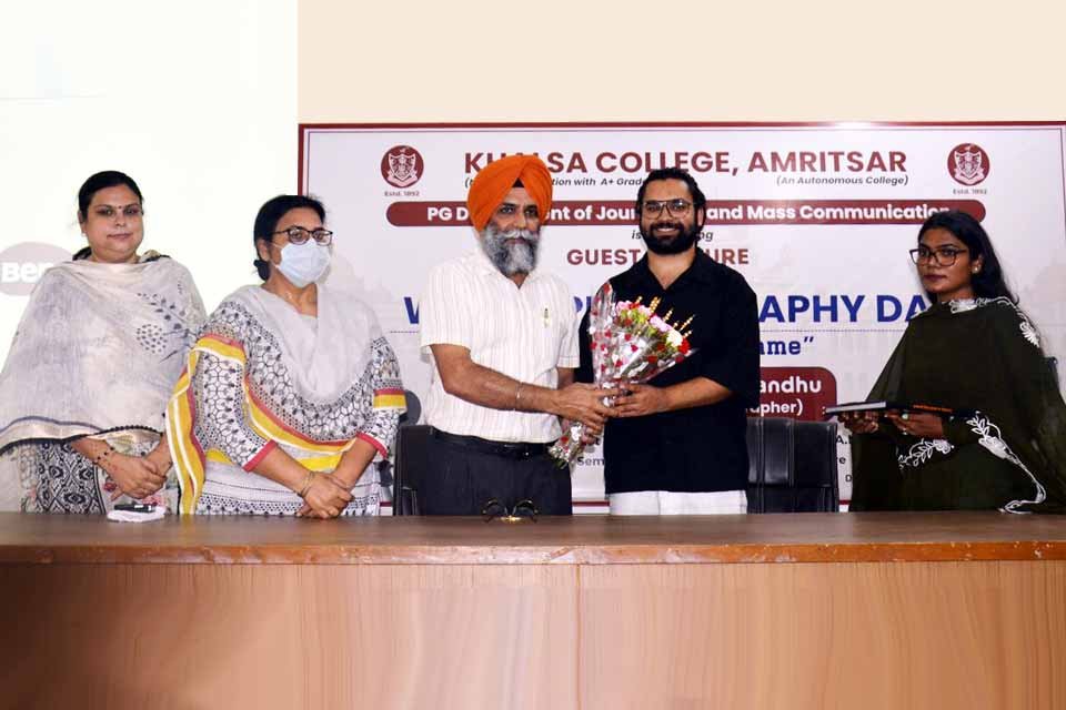 ਅੰਮ੍ਰਿਤਸਰ – ਫ਼ੋਟੋਗ੍ਰਾਫੀ ਕਲਾ ਅਤੇ ਵਿਗਿਆਨ ਦਾ ਇਕ ਅਨੋਖਾ ਮਿਲਾਪ ਹੈ। ਵਿਦਿਆਰਥੀਆਂ ਨੂੰ ਰਚਨਾਤਮਕਤਾ, ਕਲਪਨਾ ਸ਼ਕਤੀ ਅਤੇ ਤਕਨੀਕੀ ਨਿਪੁੰਨਤਾ ’ਚ ਸੰਤੁਲਨ ਬਣਾਈ ਰੱਖਣ ਲਈ ਅਤਿ ਜਰੂਰੀ ਹੈ। ਇਹ ਸ਼ਬਦ ਕਾਲਜ ਪ੍ਰਿੰਸੀਪਲ ਡਾ. ਆਤਮ ਸਿੰਘ ਰੰਧਾਵਾ ਦੇ ਸਹਿਯੋਗ ਨਾਲ ਪੱਤਰਕਾਰਤਾ ਅਤੇ ਜਨ ਸੰਚਾਰ ਵਿਭਾਗ ਵੱਲੋਂ ਵਿਸ਼ਵ ਫੋਟੋਗ੍ਰਾਫੀ ਦਿਵਸ ਦੇ ਸਬੰਧ ’ਚ ‘ਕੈਪਚਰ ਦ ਫ਼ਰੇਮ’ ਵਿਸ਼ੇ ’ਤੇ ਕਰਵਾਏ ਗਏ ਵਿਸ਼ੇਸ਼ ਗੈਸਟ ਲੈਕਚਰ ਦੌਰਾਨ ਮੁੱਖ ਮਹਿਮਾਨ ਵਜੋਂ ਪੁੱਜੇ ਪ੍ਰੋਫੈਸ਼ਨਲ ਫੋਟੋਗ੍ਰਾਫਰ ਸ੍ਰੀ ਆਫਤਾਬ ਸਿੰਘ ਸੰਧੂ ਨੇ ਸਾਂਝੇ ਕੀਤੇ।