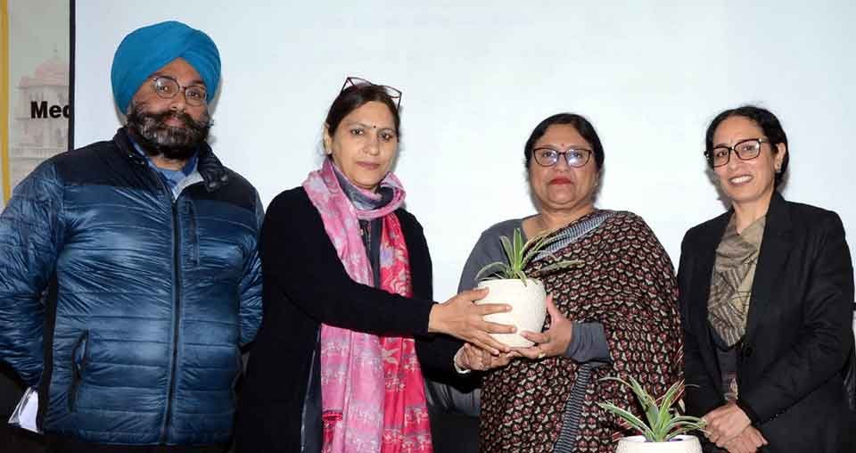 ਖ਼ਾਲਸਾ ਕਾਲਜ ਵਿਖੇ ਸੈਮੀਨਾਰ ਦੌਰਾਨ ਕਾਰਜਕਾਰੀ ਪ੍ਰਿੰਸੀਪਲ ਡਾ. ਅਰਵਿੰਦਰ ਕੌਰ ਕਾਹਲੋਂ ਨੂੰ ਪੌਦਾ ਭੇਂਟ ਕਰਦੇ ਹੋਏ ਸੁਪਨਿੰਦਰਜੀਤ ਕੌਰ ਨਾਲ ਪ੍ਰੋ: ਬਿਨੋਦ ਕੌਰ ਤੇ ਨਾਲ ਹੋਰ।