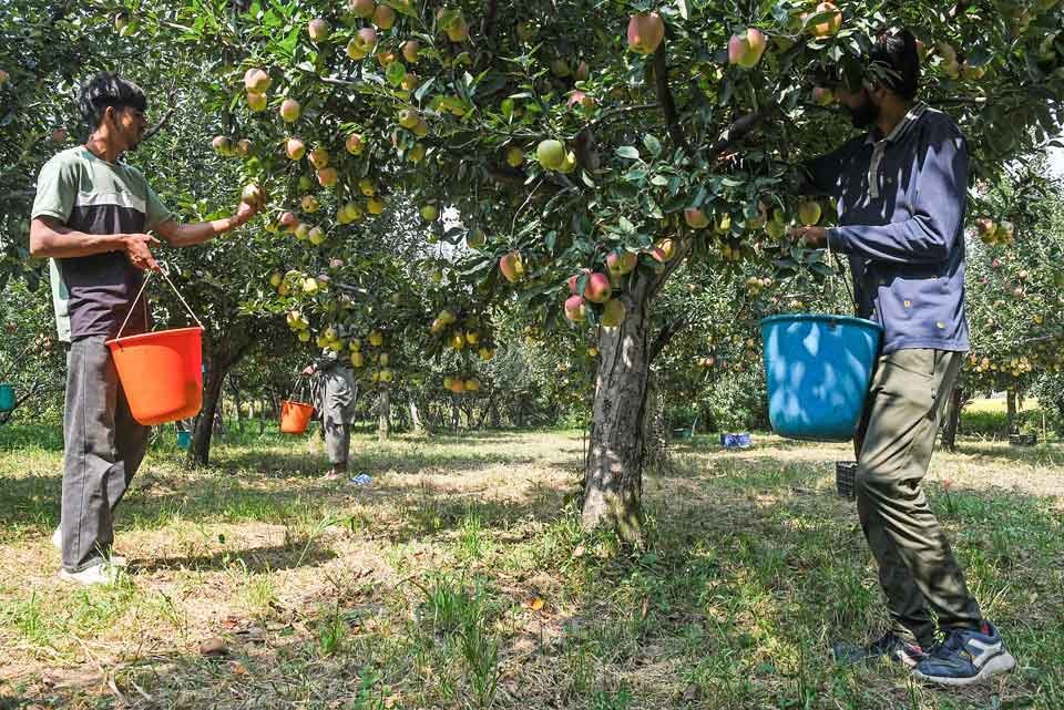 ਗੰਦਰਬਲ ਵਿਚ ਵੀਰਵਾਰ ਨੂੰ ਵਾਢੀ ਦੇ ਸੀਜ਼ਨ ਦੌਰਾਨ ਕਿਸਾਨ ਇੱਕ ਬਾਗ ਵਿੱਚ ਸੇਬ ਤੋੜਦੇ ਹੋਏ।