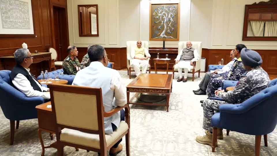 ਭਾਰਤ ਦੇ ਰੱਖਿਆ ਮੰਤਰੀ ਰਾਜਨਾਥ ਸਿੰਘ ਨੇ ਵੀਰਵਾਰ ਨੂੰ ਪਾਕਿਸਤਾਨੀ ਡਰੋਨ ਹਮਲੇ ਨੂੰ ਨਾਕਾਮ ਕਰਨ ਤੋਂ ਬਾਅਦ ਸਥਿਤੀ ‘ਤੇ ਸ਼ੁੱਕਰਵਾਰ ਨੂੰ ਚੀਫ਼ ਆਫ਼ ਡਿਫੈਂਸ ਸਟਾਫ਼ ਅਤੇ ਤਿੰਨਾਂ ਸੈਨਾ ਮੁਖੀਆਂ ਨਾਲ ਮੀਟਿੰਗ ਕੀਤੀ। ਸ਼ੁੱਕਰਵਾਰ ਨੂੰ ਰਾਸ਼ਟਰੀ ਰਾਜਧਾਨੀ ਦੇ ਸਾਊਥ ਬਲਾਕ ਵਿਖੇ ਹੋਈ ਇਸ ਦੋ ਘੰਟੇ ਲੰਬੀ ਸਮੀਖਿਆ ਮੀਟਿੰਗ ਵਿੱਚ ਉੱਚ ਫੌਜੀ ਲੀਡਰਸ਼ਿਪ ਨੇ ਲੜਾਕੂ ਵਰਦੀ ਪਾ ਕੇ ਹਰ ਤਰ੍ਹਾਂ ਨਾਲ ਲੜਨ ਦਾ ਸੰਦੇਸ਼ ਦਿੱਤਾ। ਦੇਸ਼ ਦੀ ਮੌਜੂਦਾ ਸੁਰੱਖਿਆ ਸਥਿਤੀ ‘ਤੇ ਤਿੰਨਾਂ ਫੌਜਾਂ ਨੇ ਸਰਕਾਰ ਨੂੰ ਭਰੋਸਾ ਦਿੱਤਾ ਕਿ ਦੇਸ਼ ਦੀ ਪ੍ਰਭੂਸੱਤਾ ਅਤੇ ਖੇਤਰੀ ਅਖੰਡਤਾ ਦੀ ਰੱਖਿਆ ਲਈ ਸਾਰੇ ਨਾਪਾਕ ਮਨਸੂਬਿਆਂ ਦਾ ਜ਼ੋਰਦਾਰ ਜਵਾਬ ਦਿੱਤਾ ਜਾਵੇਗਾ।