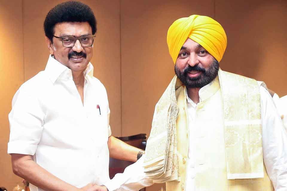 ਚੇਨਈ ਵਿੱਚ ਸ਼ਨੀਵਾਰ ਨੂੰ ਨਿਰਪੱਖ ਹੱਦਬੰਦੀ ਲਈ ਸਾਂਝੀ ਐਕਸ਼ਨ ਕਮੇਟੀ ਦੀ ਮੀਟਿੰਗ ਦੌਰਾਨ ਤਾਮਿਲਨਾਡੂ ਦੇ ਮੁੱਖ-ਮੰਤਰੀ ਐਮਕੇ ਸਟਾਲਿਨ ਨੇ ਪੰਜਾਬ ਦੇ ਮੁੱਖ-ਮੰਤਰੀ ਭਗਵੰਤ ਮਾਨ ਨਾਲ ਮੁਲਾਕਾਤ ਕੀਤੀ। (ਫੋਟੋ: ਏ ਐਨ ਆਈ)
