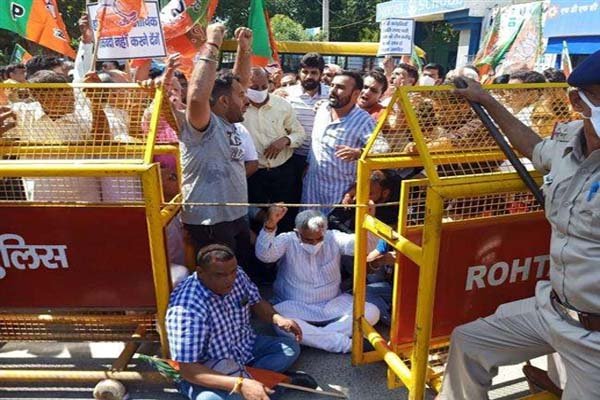 ਚੰਡੀਗੜ੍ਹ – ਕਿਸਾਨ ਅੰਦੋਲਨ ਨਾਲ ਪੰਜਾਬ ਨੂੰ ਆਰਥਿਕ ਨੁਕਸਾਨ ਹੋਣ ਤੇ ਕਿਸਾਨਾਂ ਨੂੰ ਹਰਿਆਣਾ ਤੇ ਦਿੱਲੀ ’ਚ ਜਾ ਕੇ ਅੰਦੋਲਨ ਕਰਨ ਵਾਲੇ ਕੈਪਟਨ ਅਮਰਿੰਦਰ ਸਿੰਘ ਦੇ ਬਿਆਨ ’ਤੇ ਨਰਾਜ਼ਗੀ ਪ੍ਰਗਟਾਉਂਦੇ ਹੋਏ ਭਾਜਪਾ ਅੱਜ ਸੂਬੇ ਭਰ ’ਚ ਵਿਰੋਧ ਪ੍ਰਦਰਸ਼ਨ ਕਰ ਰਹੀ ਹੈ। ਪ੍ਰਦਰਸ਼ਨ ਦੌਰਾਨ ਕਈ ਜਗ੍ਹਾ ਟਕਰਾਅ ਦੀ ਸਥਿਤੀ ਵੀ ਬਣੀ। ਰੋਹਤਕ ’ਚ ਭਾਜਪਾ ਨੇਤਾਵਾਂ ਨੇ ਕਾਂਗਰਸ ਭਵਨ ਸਾਹਮਣੇ ਨਾਅਰੇਬਾਜ਼ੀ ਕੀਤੀ ਤੇ ਧਰਨਾ ਦਿੱਤਾ। ਇਸ ਤੋਂ ਬਾਅਦ ਕਾਂਗਰਸੀ ਵੀ ਇਕੱਠੇ ਹੋ ਗਏ ਤੇ ਭਾਜਪਾ ਖਿਲਾਫ਼ ਨਾਅਰੇਬਾਜ਼ੀ ਕੀਤੀ। ਦੋਵੇਂ ਦਲਾਂ ਵਿਚਕਾਰ ਟਕਰਾਅ ਦੀ ਸਥਿਤੀ ਨੂੰ ਨਜਿੱਠਣ ਲੀ ਪੁਲਿਸ ਨੂੰ ਪਰੇਸ਼ਾਨੀ ਦਾ ਸਾਹਮਣਾ ਕਰਨਾ ਪਿਆ।