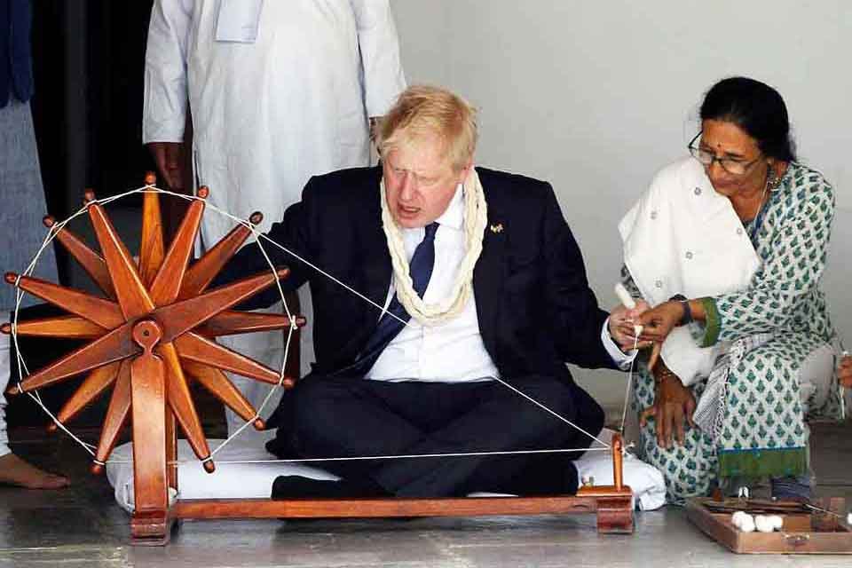 ਯੂਕੇ ਦੇ ਪ੍ਰਧਾਨ ਮੰਤਰੀ ਬੋਰਿਸ ਜੌਨਸਨ ਅਹਿਮਦਾਬਾਦ ਦੇ ਸਾਬਰਮਤੀ ਆਸ਼ਰਮ ਪਹੁੰਚਣ ਤੋਂ ਬਾਅਦ ਵਿਜ਼ਟਰ ਬੁੱਕ ਵਿੱਚ ਇੱਕ ਸੰਦੇਸ਼ ਲਿਖਦੇ ਹੋਏ। ਉਨ੍ਹਾਂ ਕਿਹਾ ਕਿ ਇਸ ਅਸਾਧਾਰਨ ਮਨੁੱਖ ਦੇ ਆਸ਼ਰਮ ਵਿੱਚ ਆਉਣਾ ਅਤੇ ਇਹ ਸਮਝਣਾ ਬਹੁਤ ਵੱਡਾ ਸਨਮਾਨ ਹੈ ਕਿ ਕਿਵੇਂ ਉਨ੍ਹਾਂ ਨੇ ਸੱਚ ਅਤੇ ਅਹਿੰਸਾ ਦੇ ਅਜਿਹੇ ਸਧਾਰਨ ਸਿਧਾਂਤਾਂ ਨੂੰ ਅਪਣਾ ਕੇ ਸੰਸਾਰ ਨੂੰ ਬਿਹਤਰ ਬਣਾਉਣ ਲਈ ਪ੍ਰੇਰਿਤ ਕੀਤਾ।