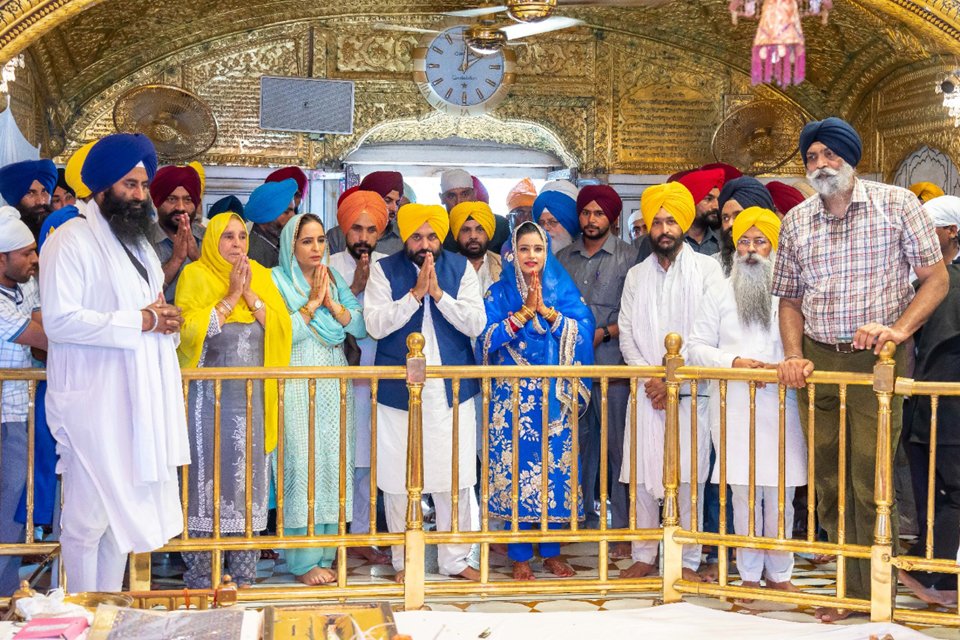 ਅੰਮ੍ਰਿਤਸਰ – ਮੁੱਖ-ਮੰਤਰੀ ਭਗਵੰਤ ਮਾਨ ਅਤੇ ਉਨ੍ਹਾਂ ਦੀ ਪਤਨੀ ਡਾ. ਗੁਰਪ੍ਰੀਤ ਕੌਰ ਵਿਆਹ ਮਗਰੋਂ ਇੱਥੇ ਸ੍ਰੀ ਦਰਬਾਰ ਸਾਹਿਬ ਵਿਖੇ ਨਤਮਸਤਕ ਹੋਏ। ਉਨ੍ਹਾਂ ਗੁਰੂ ਘਰ ਵਿਚ ਮੱਥਾ ਟੇਕਿਆ ਅਤੇ ਆਪਣੇ ਜੀਵਨ ਦੇ ਨਵੇਂ ਪੜਾਅ ਦੀ ਸ਼ੁਰੂਆਤ ਕਰਨ ਲਈ ਆਸ਼ੀਰਵਾਦ ਲਿਆ। ਮੁੱਖ ਮੰਤਰੀ ਆਪਣੀ ਮਾਂ ਬੀਬੀ ਹਰਪਾਲ ਕੌਰ ਅਤੇ ਭੈਣ ਨਾਲ ਗੁਰੂ ਨਗਰੀ ਵਿਚ ਆਏ ਅਤੇ ਸ੍ਰੀ ਹਰਿਮੰਦਰ ਸਾਹਿਬ ਵਿਖੇ ਮੱਥਾ ਟੇਕਿਆ। ਇਸ ਮੌਕੇ ਲੋਕਾਂ ਵਲੋਂ ਮੁੱਖ ਮੰਤਰੀ ਨੂੰ ਵਿਆਹ ਦੀਆਂ ਵਧਾਈਆਂ ਵੀ ਦਿੱਤੀਆਂ ਗਈਆਂ ਜਿਨ੍ਹਾਂ ਦਾ ਮੁੱਖ ਮੰਤਰੀ ਤੇ ਉਨ੍ਹਾਂ ਦੇ ਪਰਿਵਾਰ ਨੇ ਧੰਨਵਾਦ ਵੀ ਕੀਤਾ। ਇਸ ਮੌਕੇ ਸੂਚਨਾ ਕੇਂਦਰ ’ਚ ਸ਼੍ਰੋਮਣੀ ਕਮੇਟੀ ਵਲੋਂ ਮੁੱਖ ਮੰਤਰੀ ਤੇ ਉਨ੍ਹਾਂ ਦੀ ਪਤਨੀ ਦਾ ਸਨਮਾਨ ਕੀਤਾ ਗਿਆ।